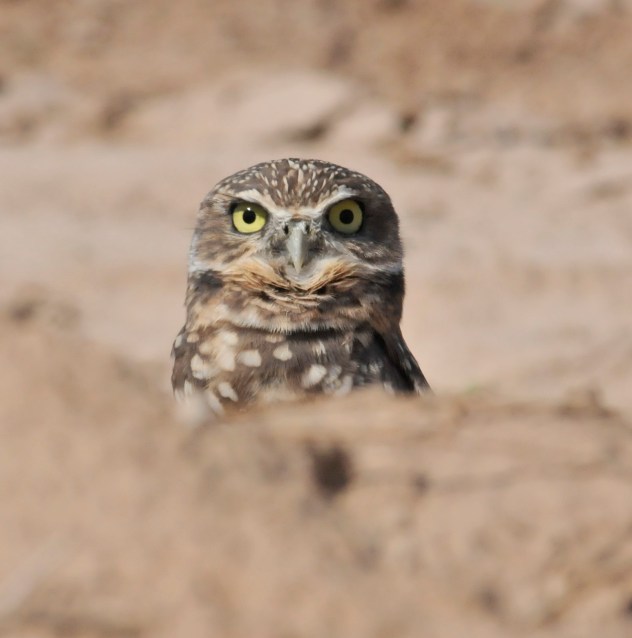 Owls are great and Burrowing Owls are even more special. This cute guy looked me over from behind a ridge of dirt. I wonder if the eyes see things differently – they are certainly not the same size and shape. Perhaps they work together to help gauge distance or enhance a three-dimensional view. Whatever the reason for the eyes, it is a cute little guy.