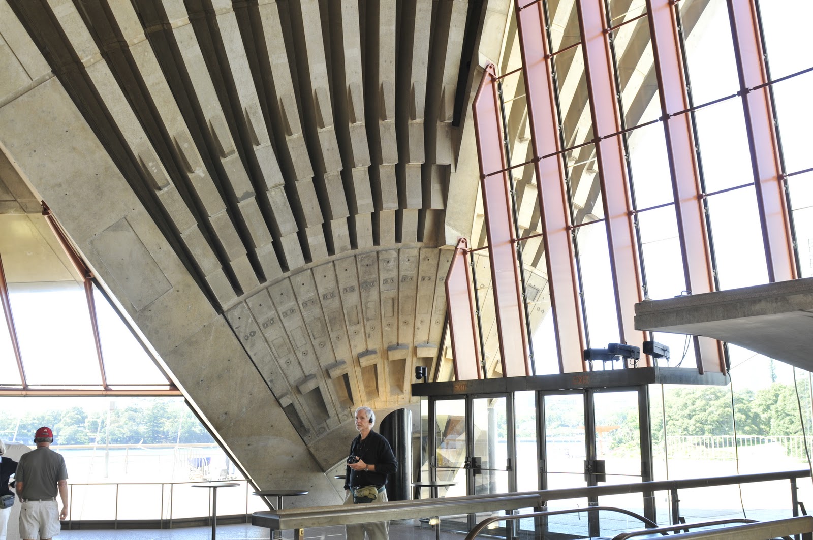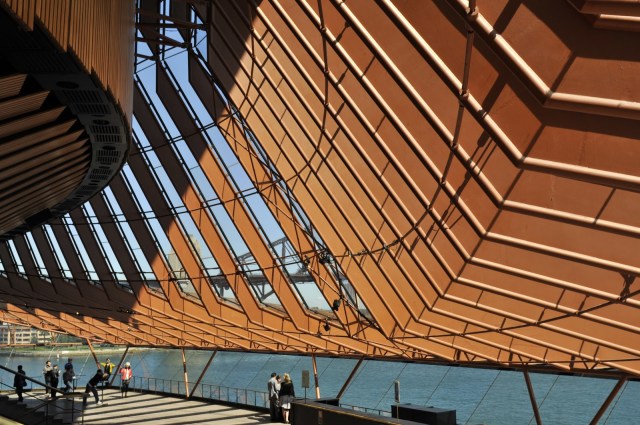This last day in Sydney is a bit of a hodgepodge. I have a talk and a walk through the Royal Botanical Gardens that last for almost two hours and then we have a one-hour tour of the Sydney Opera House – both of these are excellent and enjoyed by all. About noon there is the potential for a break if people want it. The three images above show some aspects of the Opera House. It is polished concrete and wood inside and ceramic tiles and concrete outside. The design rarely closes in on you, there are always open expanses at the end of each hall or stairway. The long arcs inside are sections of a sphere that were precast and then connected in space. It was impossible to create what the architect wanted on the ground – they tried 16 designs and almost gave up before he thought of this.