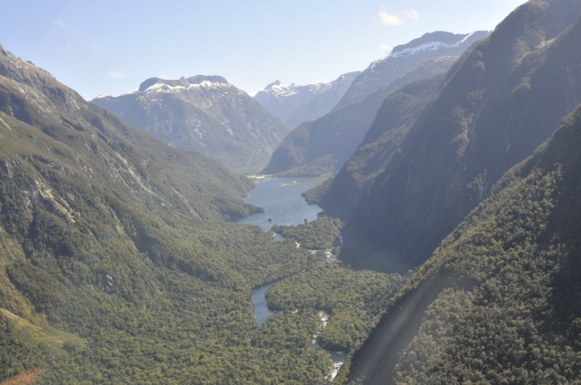 Once you descend into Milford Sound you don’t really find a town or even a village, it is more a ferry station and pier. It is from this pier that the cruise boats start of on their run out the south side and back the north side of the fiord (it is not a sound at all – sounds were eroded by rivers and fiords were carved by glaciers). The water is very deep; the boats can go right up to the rock wall with no fear of scraping bottom. There is usually more than 1000’ feet of water under the boat. This area is a World Heritage site and they have only modestly altered it in preparing it for public use. There is an airport for small planes and I was able to fly out in an 8-seat Islander. The flight was great and the vistas over the Southern Alps were staggering.