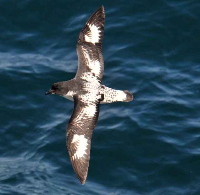 In Milford Sound; not a town but really just a dock and departure building, we boarded the Milford Mariner and grabbed a box lunch as we headed out. There were quite a few Fiord-land Crested Penguins and also a few Cape Pigeons (Pintado Petrels), a Southern Giant Petrel, a few Australasian Gannets, and two Southern Royal Albatrosses. There was a single Bottle-nosed Dolphin and a few juvenile Southern Fur Seals (actually a sea lion) and a lot of Black-backed Gulls (Kelp Gulls) and White-fronted Terns. The WFTE is as bright as a Forster’s and as elegant as a Roseate – what a nice tern. It simply glows with its bright primaries and thin jet-black bill. The Pintado Petrel (Cape Pigeon) below is not from this trip.