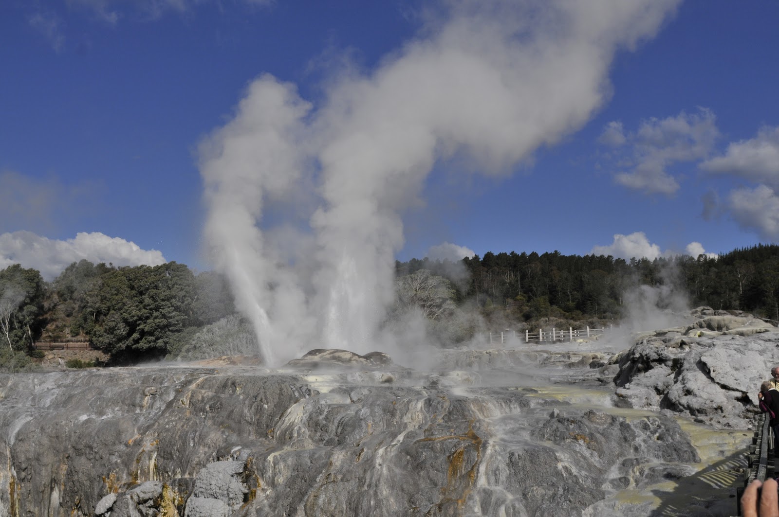 There are geysers, mud pools, hot springs and all sorts of similar configurations. The whole area of Rotorua is in an ancient caldera, now partially filled with a deep lake that has a volcanic plug in its center. The lake itself has sections that receive hot water and areas that are less impacted by the heat. The places where the sulfur-water enters are grayish in color and can be easily noted by the continual rise of steam. The island plug is now a rat-free (invasive animal-free) area where some of the rare birds that were impacted by alien species are now able to survive. These restoration projects are rather widespread in New Zealand and almost always on islands. (Google Tiritiri Matangi for a good example.)