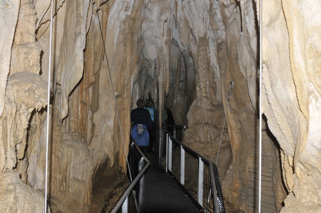 We were in the cave for almost two hours. As we passed into and out of sections the low-heat lighting would come on as we entered a new section and then go off as we departed. The temperature was cool and the air moist but comfortable overall. We had one person in a wheelchair and the pathways were more than adequate. (Coming up the spiral ramp in the “silo” to exit the system was a bit of a push – but it was smooth and gradual.)
