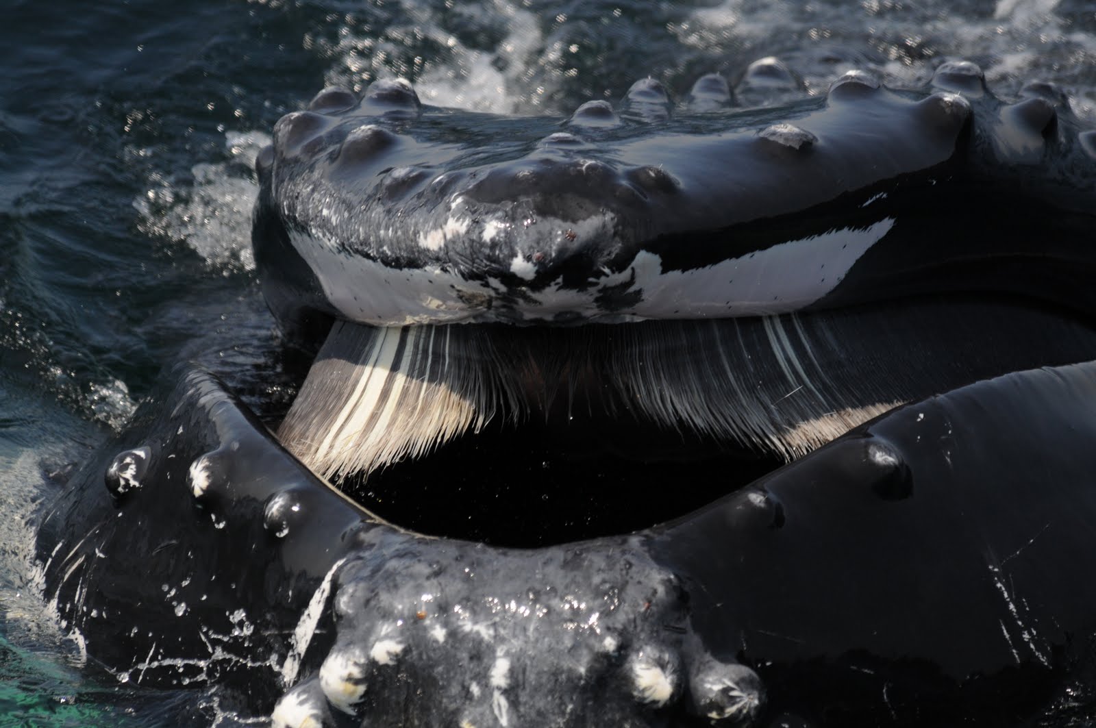 Right Whales have a large arching mouth; with a narrow upper jaw and a large curving lower jaw. There are about 300 baleen plates that look like a very large and very fuzzy comb. The inside edge of the baleen is fuzzy (think split ends) and can capture very small prey. Using the Google-derived image above imagine the mouth closed so only a small opening exists in the very front. That is how they swim in food-rich waters. The baleen is not all the same length; but much like piano or harp strings they lay together in a harmonious sweep from small to very long; the longest plates of baleen on an adult whale will be about 9′ in length.