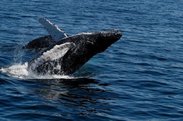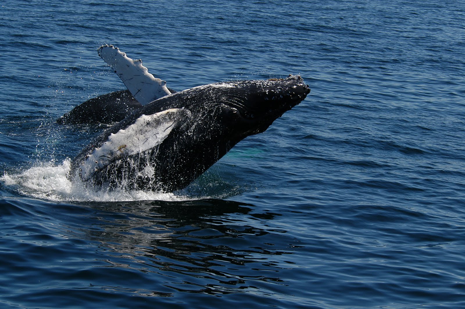 The flukes and fins (there is no dorsal fin remember) are broad and appear stubby to those who have seen Humpback Whales. The blow from a Right Whale is very much V-shaped and low. The two blowholes are rather widely spaced and large; hence the low, bushy-shaped blow.