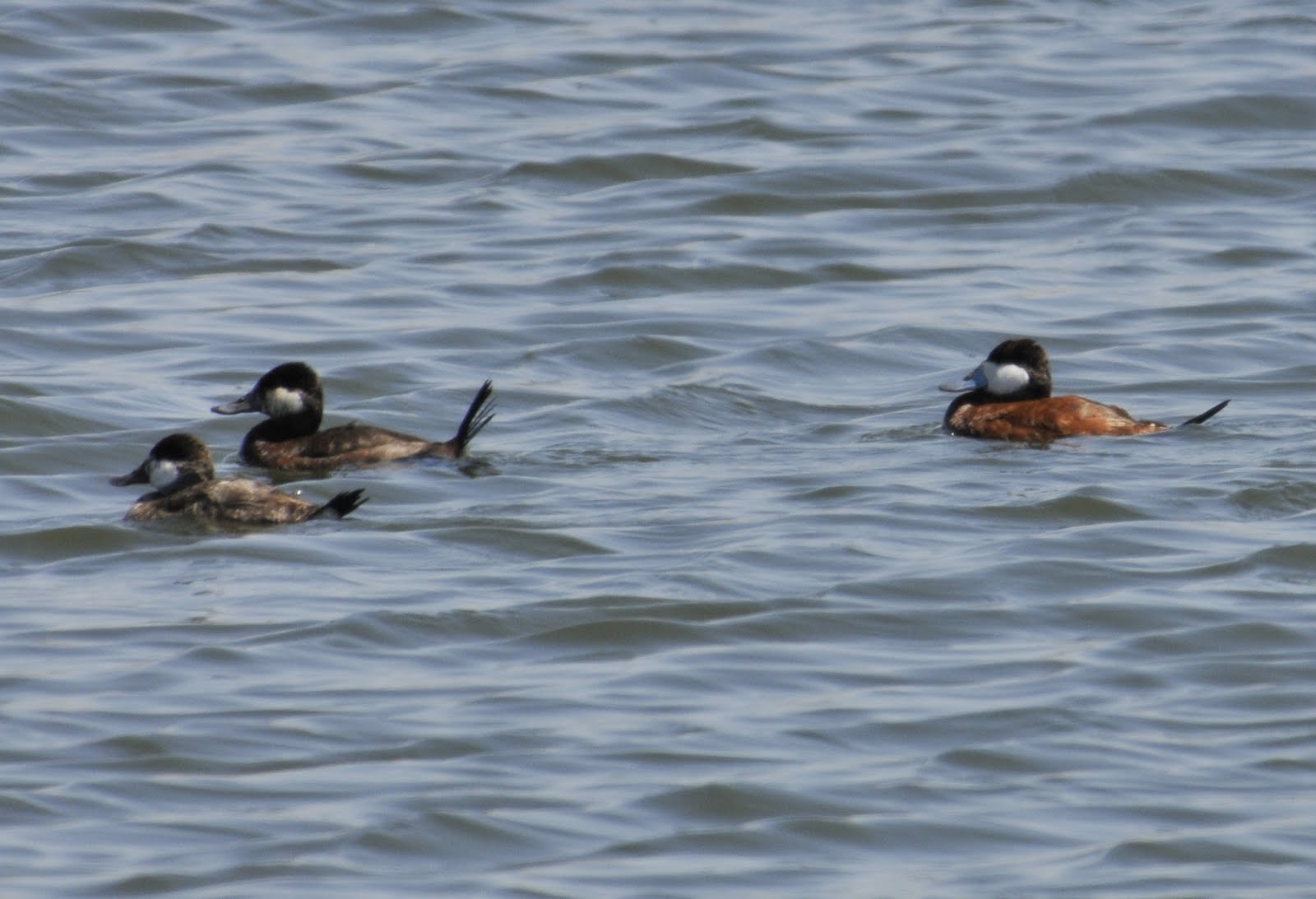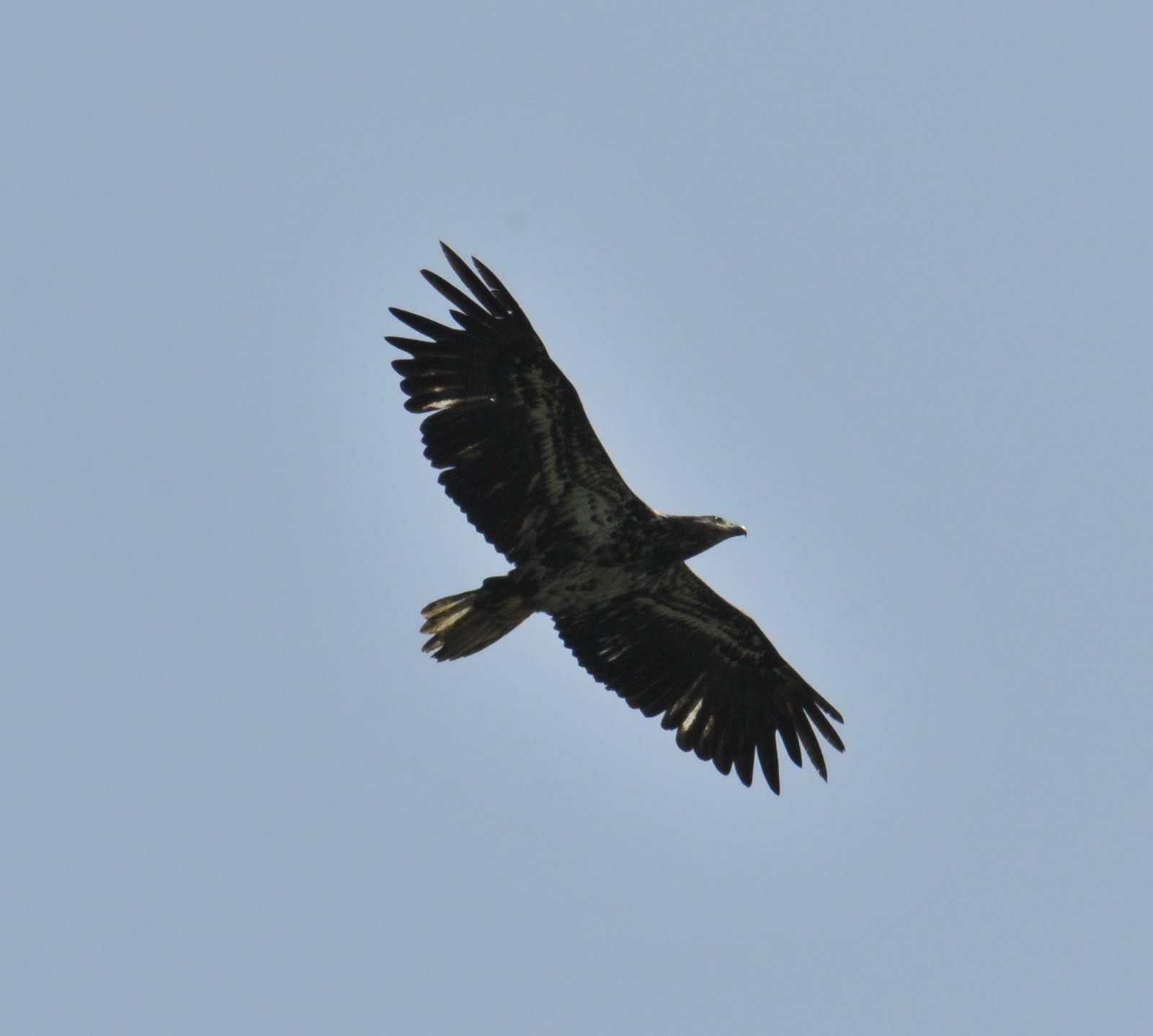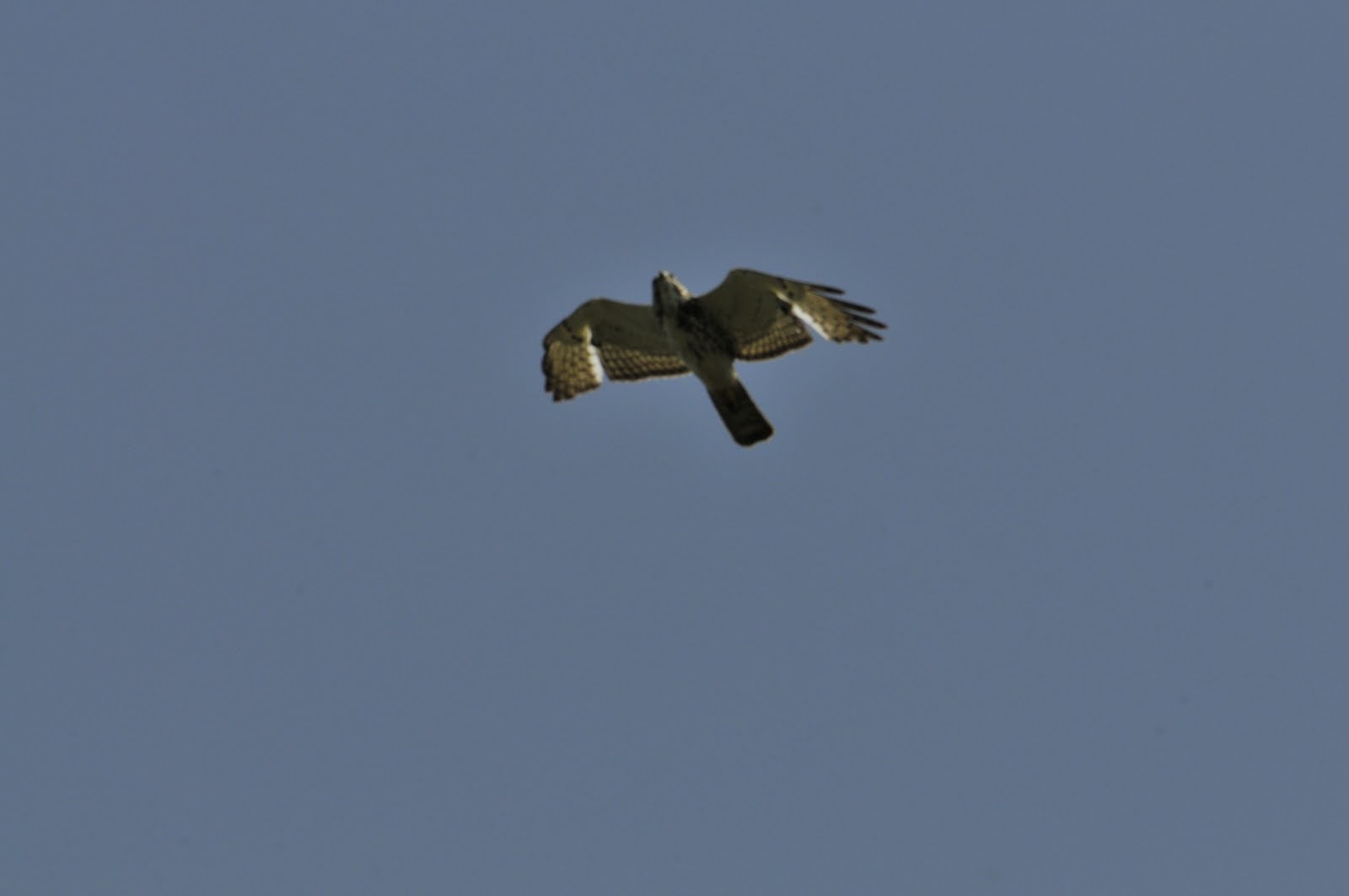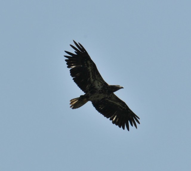 While traveling north of Traverse City on the Leelanau Peninsula we bumped in to a large number of migrating birds of prey. There had been no southern air moving north for quite a while and this warm and breezy day was just what they needed. The adult birds had pushed through the early weather but the non-breeding younger birds seemed to have lazed along and were all bunched up mulling over the water-crossing that was ahead of them. We had several hundred Broad-winged Hawks, Bald Eagle, accipiters, and Turkey Vultures soaring above the cherry orchards of the northern part of this peninsula. It was pretty nice. The blurry images below show the crescents in the wings and the split tails on many of the Broad-wings. Young eagles are very dark. The Turkey Vultures were not all young as might be seen by the reddish heads.