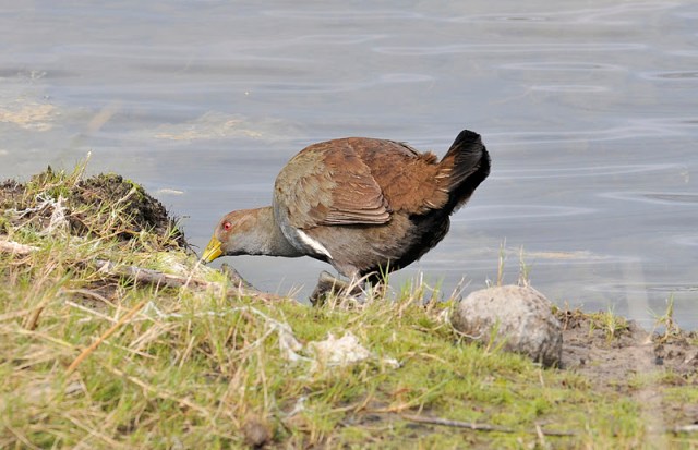 | The Tasmanian Native Hen (TNH) is a flightless gallinule of impressive size. Like the birds of New Zealand the Australian birds, mammals, and reptiles had only a few rapacious predators. There are many carnivorous animals to be sure but flight was not always necessary for escape and survival. New Zealand leads the way way with both ancient and modern flightless birds as there were no mammal predators in New Zealand at all until dogs and cats were introduced. But, in fact, many preadtor-free Pacific Ocean islands have evolved flightless birds (usually water birds like rails and gallinules). The TNHen is found in grassy areas and thus can be seen around agricultural areas. It is certain that modern land use has allowed the TNHen population to grow. There is certainly more grass now that 200 years ago and almost certainly more native hens. We found them in remote parkland and developed farm land as well as in urban areas at (street runoff) retention basins in the middle of Hobart. |