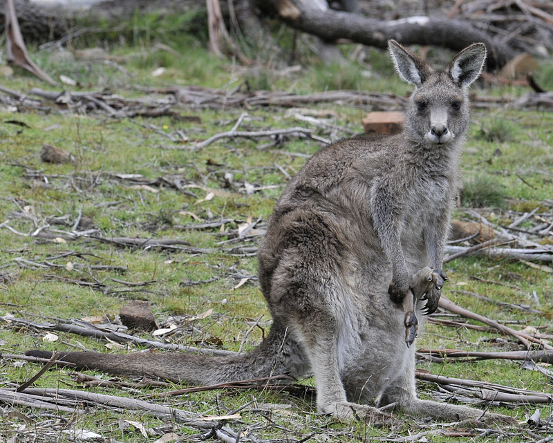 | There are several hopping animals on Maria; both kangaroos and wallabies can be found. We had lots of Eastern Gray Kangaroos on the open grassy areas and a couple (probable) Red-necked Wallabies in the forest. If you look closely at the female Eastern Gray in the photo above you can see the feet of the joey that has clambered headfirst into the female’s pouch. The family to which kangaroos belong also contains wallabies, wallaroos, pademelons, and tree kangaroos. In general the kangaroos are the largest and the pademelons are the smallest. The Tree Kangaroos are now largely found only on the islands to the north (like New Guinea) and are tropical forest animals. The kangaroos are the large grazers much like antelope, bison, and deer and the wallabies and pademelons are more equivalent to rabbits and dik-diks, the smallish grazing animals found on other continents. |