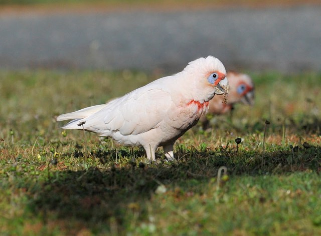 The large Sulphur-crested Cockatoos (as shown in the 3rd image below) are often rather tame features of urban parklands. They were also very common in farmland outside the cities. As they probe in sod (and rip and tear and dig) they do favor maintained grassy areas. The call of the Sulphur-crested Cockatoo (and most parrots of any kind) is a loud raucous screech – quite unpleasant overall.