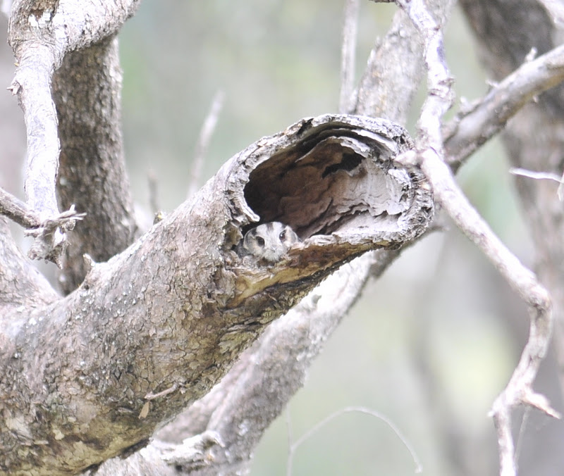 The dry area that we finally ventured into was a foot or two lower than the level of the gravel road and was vegetated with a shrubby eucalyptus trees and rather lush grasses. As moisture is not permanent here, the fallen branches decay very slowly and we worked our way through and around this woodland for a while. There were several honeyeaters and a few wood-swallows as we walked. Finally we looked ahead about thirty-five yards into the broken stub of a tree; the cutest bird in the world looked back! We thought it might be a doll or a kid’s teddy-bear, but it was an Owlet-Nightjar. This is one of Australia’s special birds; rather widespread actually but thin on there ground and not easy to locate and see. We were thrilled.