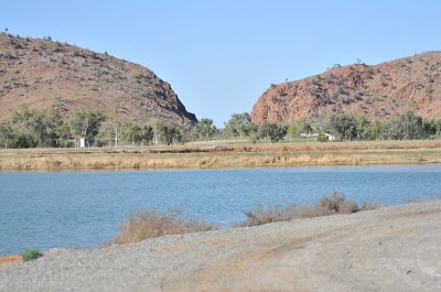The sinuous MacDonnell Ranges mountains are similar in origin. The image to the left (over one of the sewage lagoons outside Alice Springs) shows one end of the low esker-like range on the left and another on the right with the Heavitree Gap in the middle. The “mountains” of the MacDonnell Range have gaps spaced along their length. They are surprisingly rugged for smallish geologic structures; but remember they are the remnants of huge mountains that once loomed over this area.