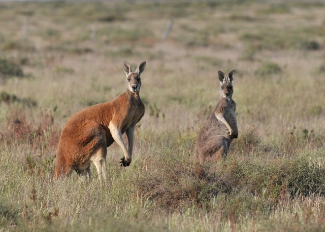 The kangaroos, wallabies, pademelons, and tree kangaroos are all hopping marsupials adapted to the varied habitats of the region. Tree Kangaroos are now found only in the Australian tropical forests (but are more common in Borneo and Papua New Guinea). The others are all found throughout the country. The kangaroos are the largest in stature and the Red Kangaroo is the largest of them all. The image below is of a large buck Red Kangaroo and a couple smaller grayer females that we happened on way while we were out in the middle of nowhere. The male was stunning in size and deportment. The females are called “blue-flyers” because they are faster than the males and the gray fur is often a slate-blue color.