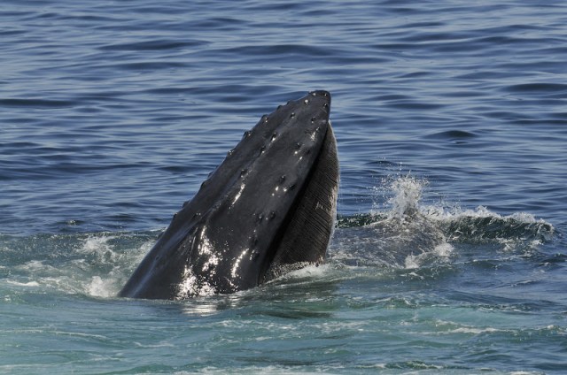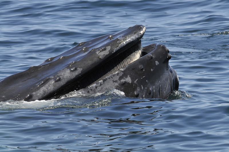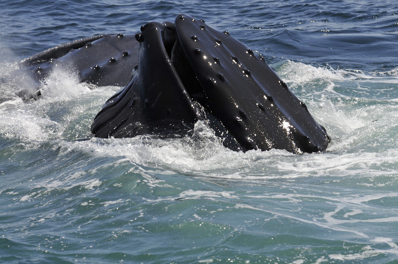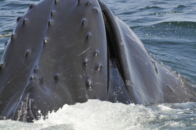 The whale above has taken in a huge gulp of sea water; hopefully full of Sand Lance. It will now squeeze the water out through the baleen and concentrate the fish. The pleats, or rorquals, are the pleated parts of the under throat and anterior belly can expand greatly. There can be hundreds of gallons of fish-rich water drawn in this ante room. Once the water has been forced out of the “gullet” the fish are swallowed down a rather small throat. Where we were Sunday, there had be millions of Sand Lance as there were whales and birds in profusion. A wet and salty buffet table like you rarely see.