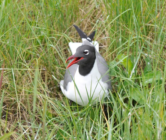 The Laughing Gulls nest in thick, and seemingly moist, vegetation in swales and hollows in the grassy dunes. They are often associated with Poison Ivy patches, Beach Rose, and Seaside Goldenrod. One of the great treats that the Laughing Gulls provide is at the end of the summer when the common ant of the sand dunes sends forth tens of thousands of gravid females prospecting for drones and suitable habitat to start a new colony. The Laughing Gulls “flycatch” these ants hour-on-end sometimes following them inland as the sea breezes carry the ants away from the dunes.