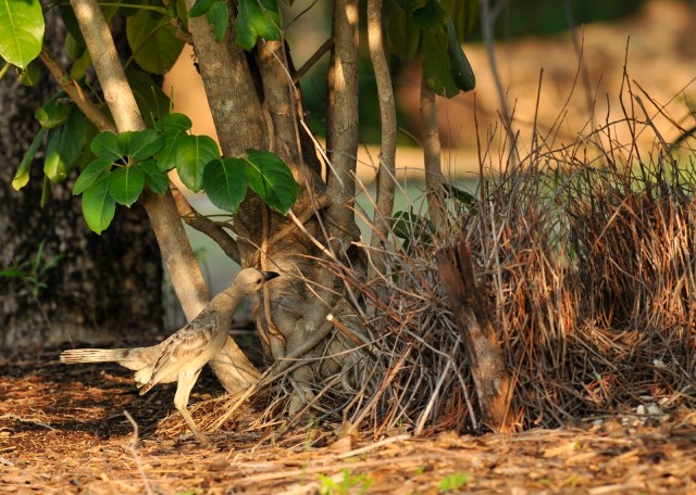 | This rather dull looking bird belongs to a very special group of birds; it is a bower bird. The males of this group make bowers to impress and attract females. This male is inspecting his bower. The hundreds of twigs on the right side form a “U” shape. The male will bring shells, glass, and bits of metal to the front of the bower hoping to impress a female. The bird is smaller than a crow but a bit larger than a Blue Jay, so there is a great deal of time, effort, work, and energy represented by the woven mass of sticks. There are about ten species of bowerbird in Australia. |