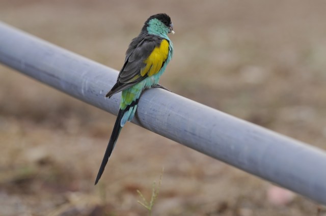 | One of the highlight-birds of Pine Creek was the Hooded Parrot; above and below. This is a rare bird, listed as an uncommon endemic. Endemic meaning that it only occurs in Australia and in this case only in a few spots in the norther part of the Northern Territory. We found groups of 15 to 30 right in town and had the fun of showing them off to several other birders passing through the area. Getting back to termites for a moment, it should be noted that this species nests in holes in termites mounds. Though you often look for birds, parrots especially, in trees, we found the Hooded Parrots on the ground feeding like mice on the seed heads of a low-growing flower. The female is pale gray underneath and a soft green on top; she has no cap, yellow patch, or turquoise cheeks. The books call he a “dull olive” but she is nicer looking than that implies. |