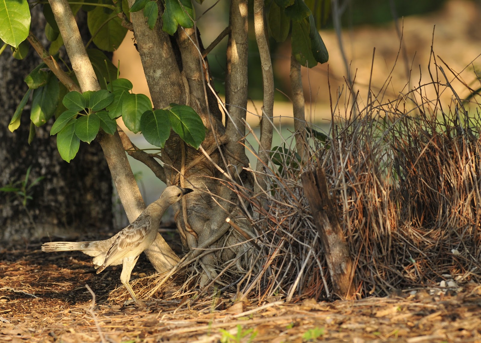 | This rather dull looking bird belongs to a very special group of birds; it is a bower bird. The males of this group make bowers to impress and attract females. This male is inspecting his bower. The hundreds of twigs on the right side form a “U” shape. The male will bring shells, glass, and bits of metal to the front of the bower hoping to impress a female. The bird is smaller than a crow but a bit larger than a Blue Jay, so there is a great deal of time, effort, work, and energy represented by the woven mass of sticks. There are about ten species of bowerbird in Australia. |