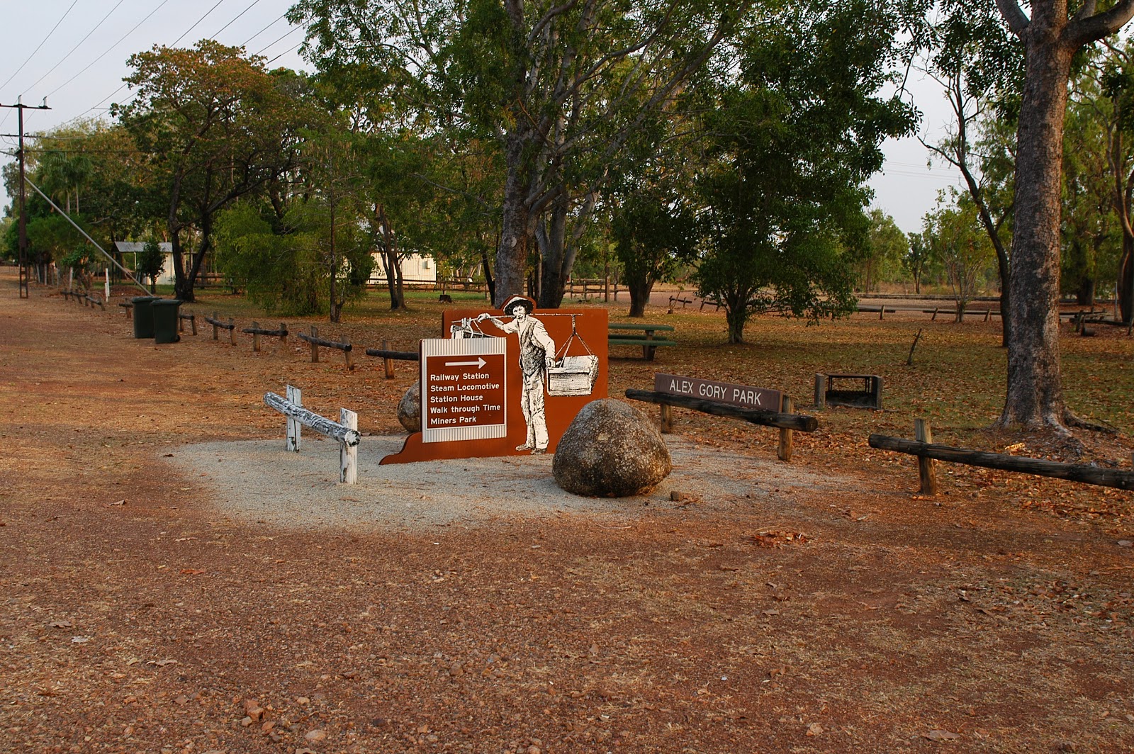 | Pine Creek has a central parkland that has a museum, picnic tables, and water; everything a birder needs for a nice visit. The railway museum was always closed but many of the exhibits were out doors anyway. The picnic tables had locals and travelers at them pretty much all day but we often ate lunch in the car watching a group of Australian birds. But the water, several pools surrounded by lush vegetation, attracted us and a multitude of birds as well. The water is the big deal here. they actually water the central parkland strip each morning making it very attractive and surprisingly green in a land of (seasonal) browns. |