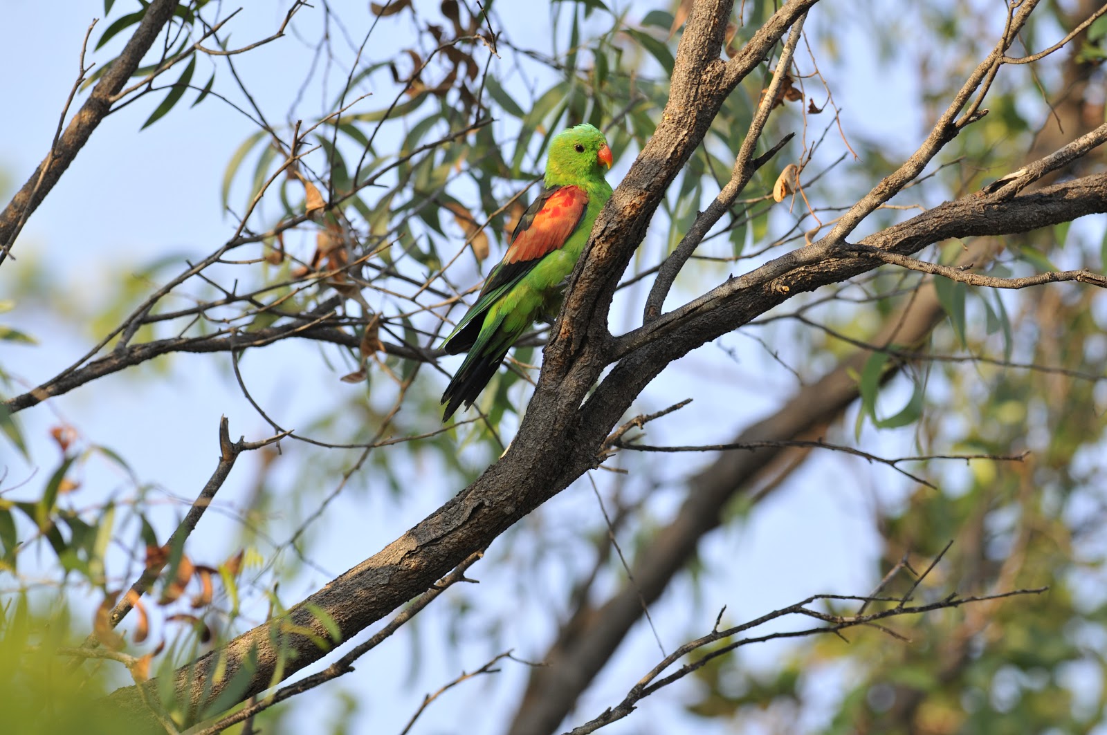 | The Red-winged Parrot was a regular member of the avian group using the town’s central park lands. This species seemed to favor mangoes and spent a good deal of time peeling them. |