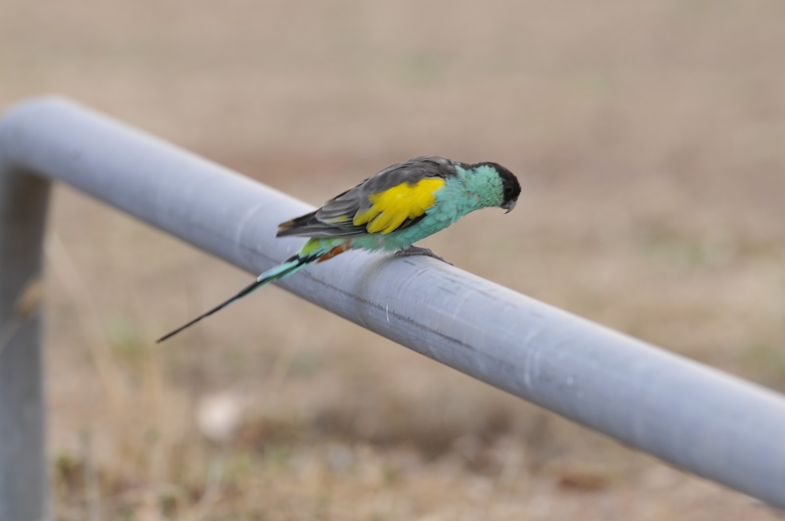 | One of the highlight-birds of Pine Creek was the Hooded Parrot; above and below. This is a rare bird, listed as an uncommon endemic. Endemic meaning that it only occurs in Australia and in this case only in a few spots in the norther part of the Northern Territory. We found groups of 15 to 30 right in town and had the fun of showing them off to several other birders passing through the area. Getting back to termites for a moment, it should be noted that this species nests in holes in termites mounds. Though you often look for birds, parrots especially, in trees, we found the Hooded Parrots on the ground feeding like mice on the seed heads of a low-growing flower. The female is pale gray underneath and a soft green on top; she has no cap, yellow patch, or turquoise cheeks. The books call he a “dull olive” but she is nicer looking than that implies. |
