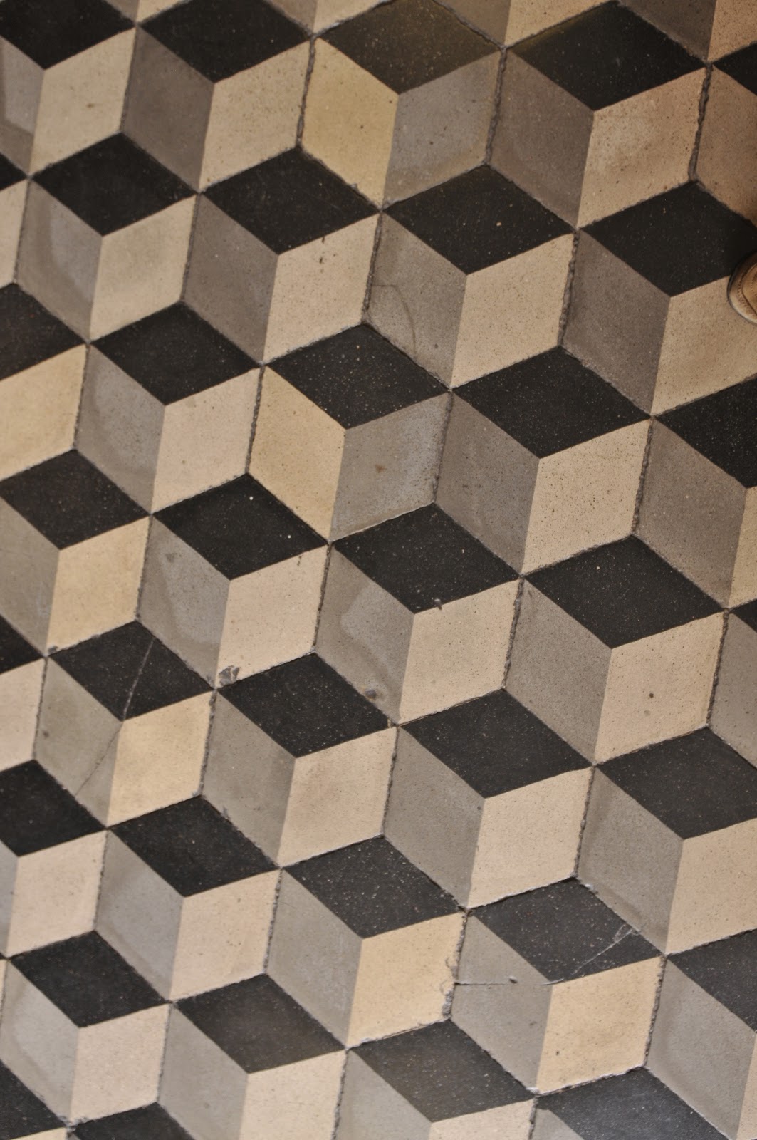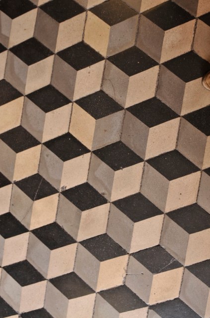 The pattern below seems to be an abstraction, deception perhaps. Something Escher might have drawn. In fact it is part of a museum tile floor and the tiles are hexagonal. I cannot find the edges nor can I convince myself (as I look at the picture) the image is not three dimensional and vertical. Next time I am there I will take a photo with a pair of feet (human) standing on the design just to give my depth perception something to hold on to.