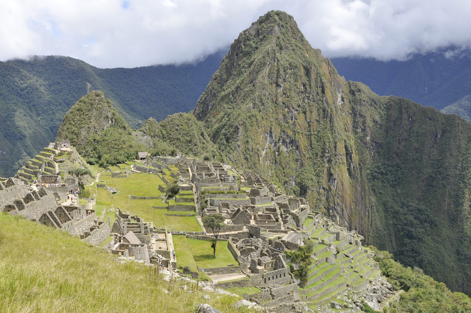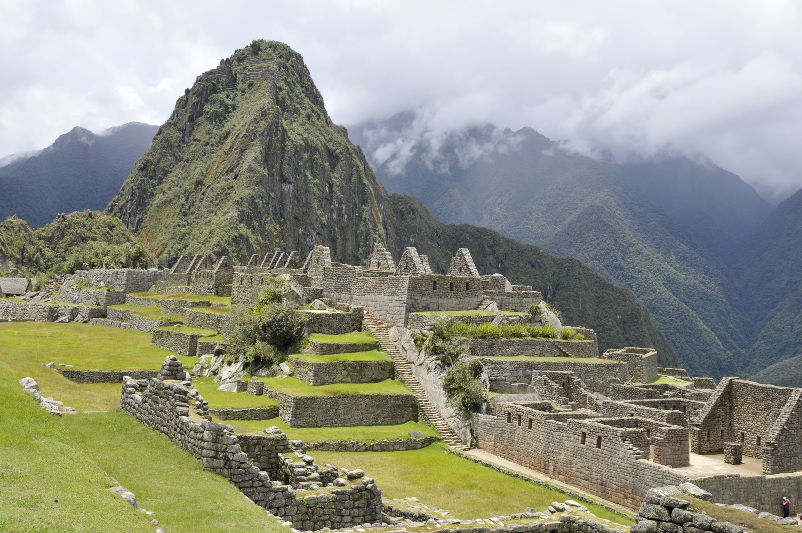 Though the elevation in the area of Machu Picchu is around 8000′ and people lived here for generations, it is not really level. The entrance at the Sun Gate is a hearty climb from the public gates onto the site which are at the level of many of the terraces. The nearby peak, called Huayna Picchu, is another 1000′ or so above Machu Picchu. That is 1000′ of vertical, loose, damp, mountainside. Huayna Picchu is shown in the image below. Notice that there are terraces very near the top of Huayna Picchu.