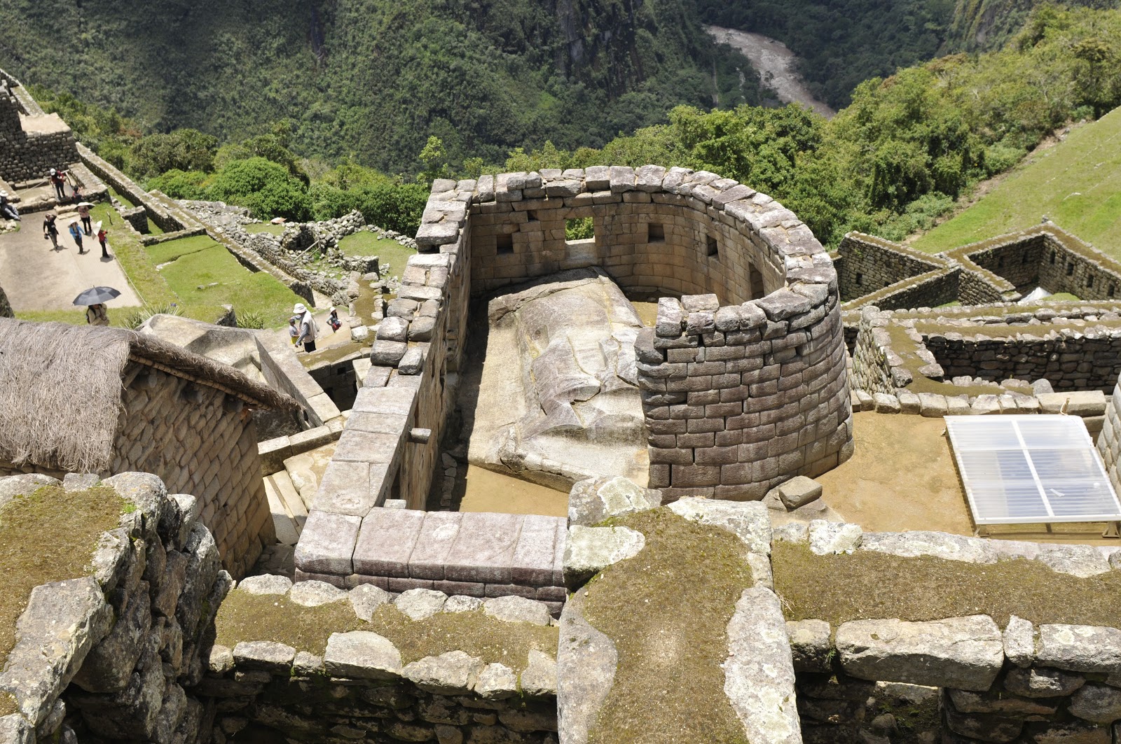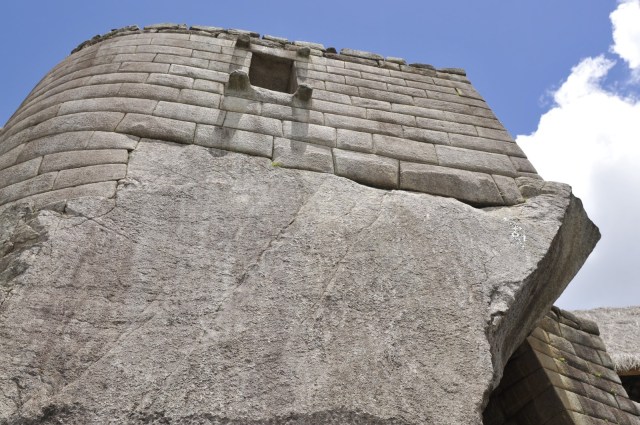 The two images above are of the Sun Temple or Torreon. This city seems to have been rich in celestial and religious significance; though no one knows where one begins and the other ends. The window/door in the upper picture, that looks out over the river valley, lines up the rays of a rising sun on the summer equinox with a carved line in the natural rock rising in the floor of the room. The picture immediately above shows how the Inca used the natural stone where they could and added hand worked stone to create the additional form and space needed. The Urubamba River is down a very precipitous slope of about 1500′ Machu Picchu.