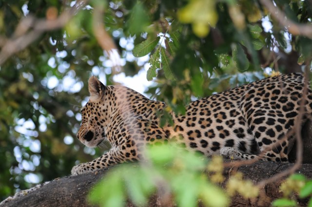 | Leopards are less common, though very widespread, and more difficult to locate. They are strong cats and can carry prey weighing almost their own weight into a tree. They do this to keep prey from being taken away by opportunistic lions and hyenas. Most leopards are solitary with females and young the only dependable association. Though ranges of individuals will often overlap they remain solitary. Most youngsters are independent before they are two years old but are allowed to remain in the mothers range as they develop hunting skills. They are rather catholic feeders; eating from about 30 different species, where lions rarely exceed ten species. Leopards eat birds, small mammals, and insects in addition to the mainstay of small antelope and the young of larger antelope. |