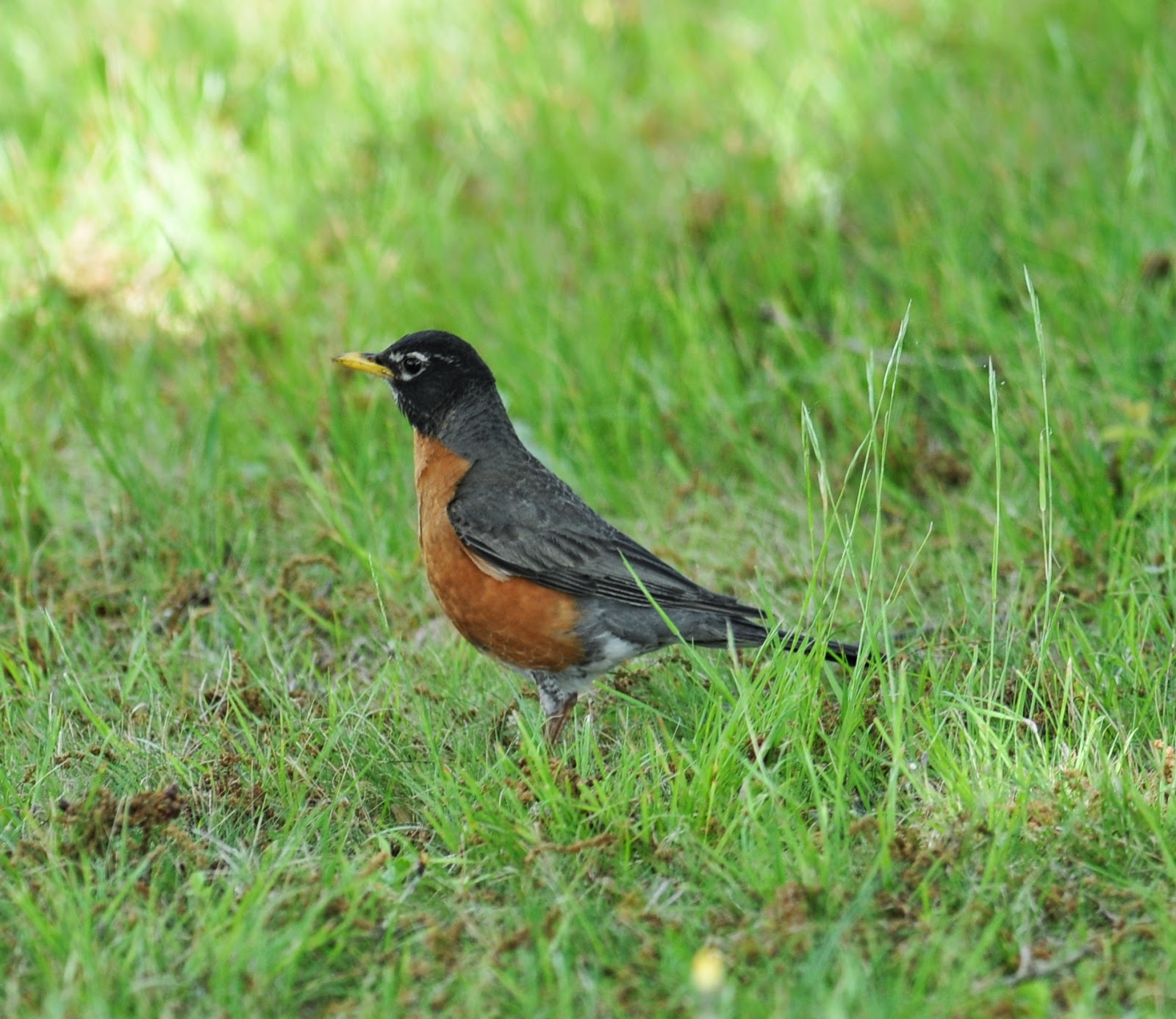 | While the pair of Brown Thrashers was gathering food there were two other species in the same area also gathering food. The bird above is a male American Robin and the bird below is a Chipping Sparrow. Both of these birds will nest in the same habitat of low dense brushy growth. The Chipping Sparrow is a bit more of a treetop bird and the robin is so widespread that is common in woodlands and suburban settings at all levels and in all vegetation. |