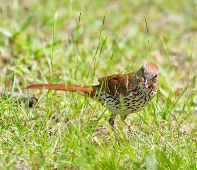 | The bright eye of the Brown Thrasher can give it a piercing and intense look. The above image shows the rather long legs and dark streaking on the underside. |