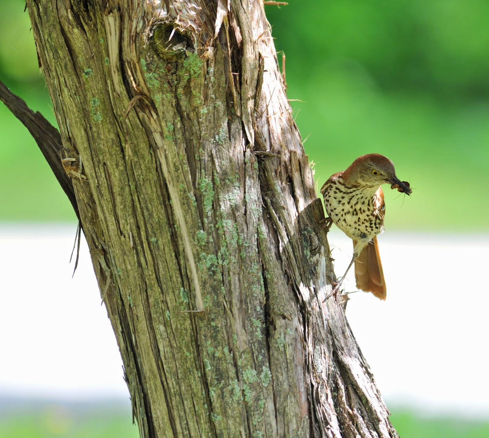 | The Brown Thrasher is a bird of the United States with only a modest incursion into Mexico in the winter and slightly into Canada in breeding season. It is found in the mid-west and east though it is not always an obvious member of the avian community. Here in Massachusetts we hear them singing only until they find a mate then they go quiet. Like most birds this size, the eggs hatch in about two weeks and the young fledge about two weeks later. |