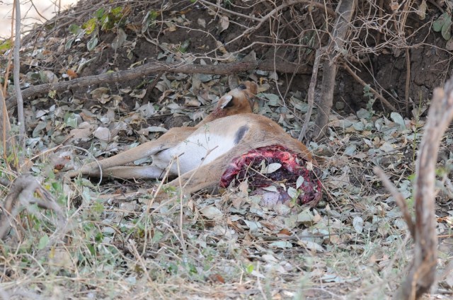 | She had most of this impala remaining so her desire to hunt was not based on food but on a cats instinct and desire to hunt. |