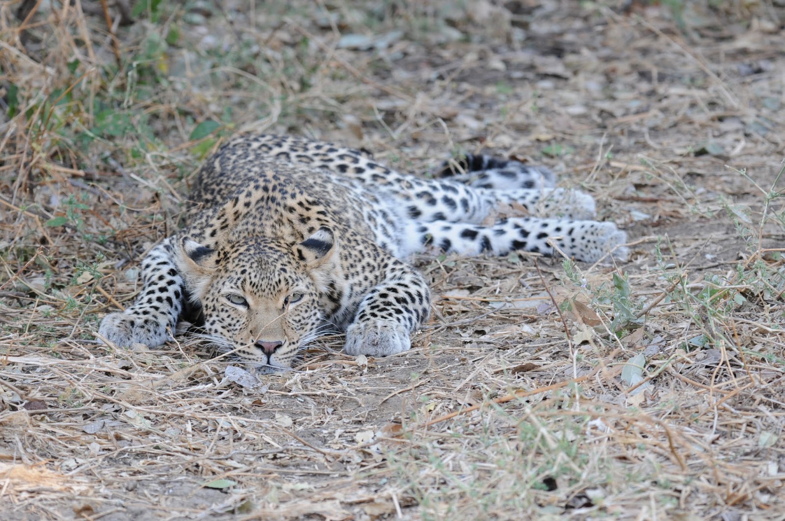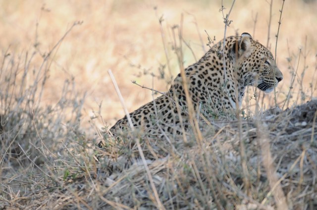 | When she relaxed she lay out on the ground usually right out in the open. Most leopards learn to climb trees to avoid encountering troublesome competition. It is probable that when lions or hyenas arrive to steal her dinner she will learn to (both) hide her food and herself in the local trees during the stay and during siesta time. If she doesn’t learn this lesson the lions and hyenas are likely to kill her or at least make her regret learning slowly. |