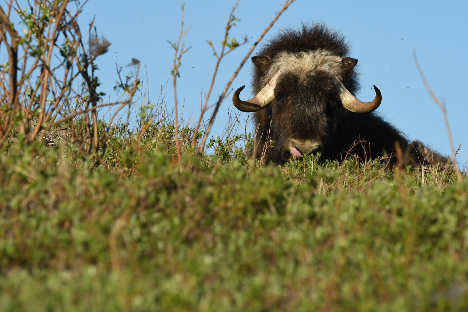 Though the temps were quite warm, hot actually, we rarely had any number of mosquitoes. But if you look closely at the image above there are lots of insects around the head of the Musk Ox. We had intense and dynamic hatches of Chironomids (midges) drifting along the road near Safety Lagoon and occasionally a few mossies, but bugs were not a feature during our visit.