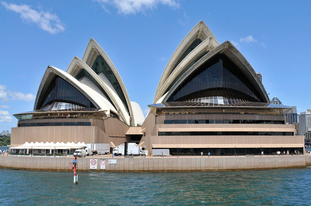 The view of the Opera House from a boat on the Sydney Harbor reminds me of a group of feeding humpback whales. I think that it is supposed to feel more like a ship on the harbor whether you are inside or outside. Certainly the view shown below gives the feeling of being on the bridge of a large and magnificent ship.