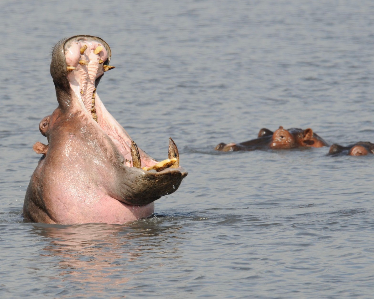 Like elephants, hippos are declining rapidly because of poaching. The large teeth are sought after for carving and for a wrongly presumed to have a medicinal value. Loss of wetlands and grazing habitat (mostly to farming) also is having an impact.