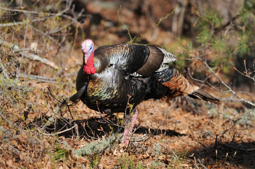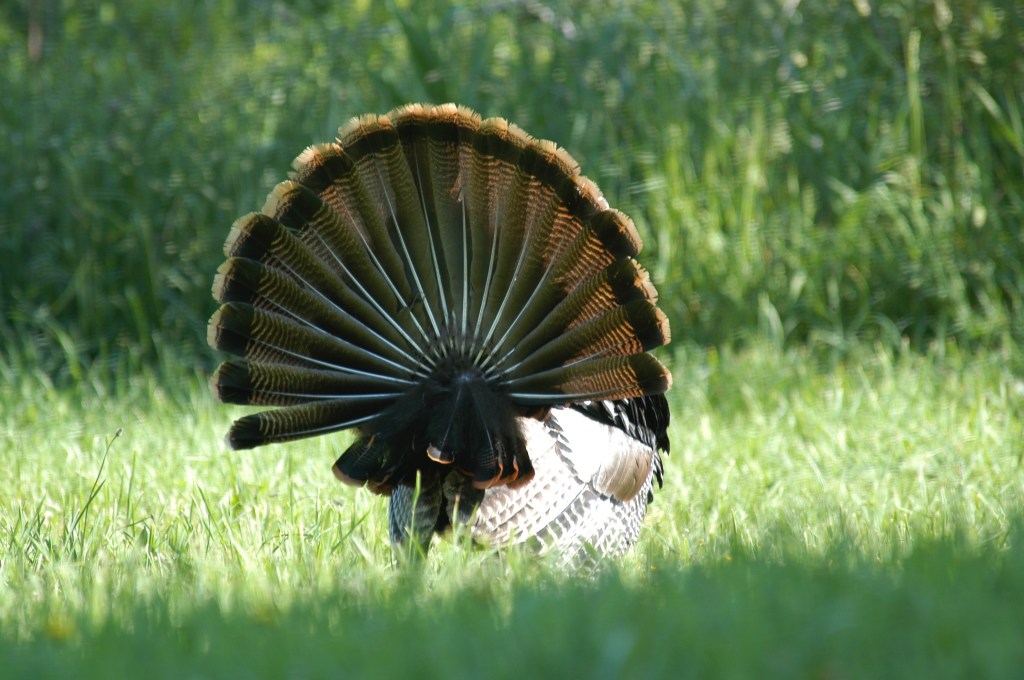 Wild Turkeys have been very successfully reintroduced into Massachusetts – and else where. They are now well established and can be found the full length of the Commonwealth; from Provincetown to the Berkshires. The females (above and below) have no beard and are not as colorful in the face as are the males. Females have a rather passive role in the spring. They observe and then choose (?) from the males who have largely ignored them as they flash, strut, and compete with other males.Males have a beard and the unfeathered facial skin becomes very colorful as breeding season approaches. The feathers are iridescent and the boys make very effort to show them off. Small groups of males stay together seemingly competing among themselves for breeding dominance. This is what they are doing, but it seems a little more time with the ladies might be beneficial. Facial color, shiny feathers, and a large complete tail make for a handsome male. The females will nest on the ground but both sexes will roost in trees – though females will often incubate through the night on the ground.Eventually the hens create clutches of eggs (usually about 12 eggs), incubate for about 4 weeks, and hatch the young. Groups of hens with young will form and the occasional cluster of males may join in with them. But generally it is the females that watch over the youngsters. Predators include (depending on the size of the poults) cats, dogs, foxes, coyotes. and probably some birds of prey. The eggs are consumed by medium sized mammals like raccoons, opossums, and foxes. As they grow in size they become more and more able to take care of themselves.