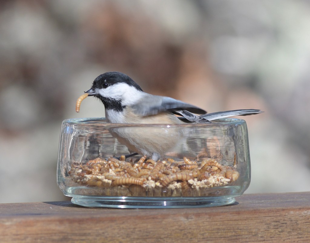 The Eastern Bluebirds (EABL) whose image leads this post off started my thinking about using meal worms this winter. The bluebirds came in one day a few weeks ago and I immediately sent away for meal worms. They arrived and I started putting them out on the deck rail. The following images show what happened. It has been fun having the worms and the birds – but those Eastern Bluebirds never returned and never ate a single meal worm.