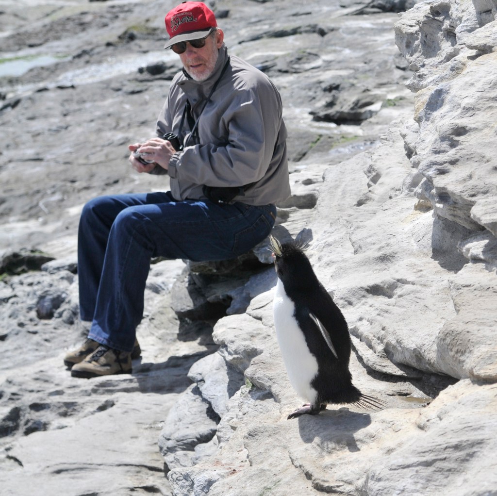 Let’s move to Rockhopper Penguins, another of the smallish penguins. This bird belongs to the “crested penguin” group and is the smallest of those. This group; Rockhopper, Fjoirdland Crested, Macaroni, Erect-crested, and Snares are characterized by a yellow or orange flag of plume-like feathers that arise near the base of the bill and flag out over the side of the head. This is what was called “macaroni” in Yankee Doodle Dandy song. Rockhoppers nest pretty much all around the southern end of our globe; that is they are circumpolar. There are two populations (subspecies) and both of them are found on islands well north of the continental ice of Antarctica.