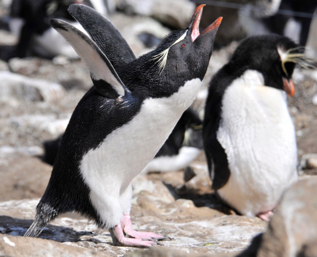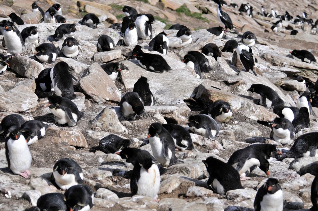 The erect feather give the Rockhopper a bit of a punk look. The bill is dark red and feathered extensively on the underside. These are noisy birds. The nesting colonies are raucous with calling and braying throughout the day. Incubation takes about 5 weeks, two eggs are laid with the first egg smaller than the second. Invariably the first chick does not survive. The nesting colonies are closely associated with nesting Black-browed Albatross colonies. Nesting colonies can be quite dense. The birds are just of reach of their neighbor but that doesn’t stop them from stealing nest pebbles from each other – over and over again. The nest sites can be quite some distance inland and upland as well. Many colonies are essentially on cliff faces and the birds have to climb and scramble to and from the nest.Some paths to the colony are over nice dry and rather smooth rock. Other pathways are battered by waves and replete with near vertical slopes. Like most penguins fear isn’t apart of their day. They are not land-based but seem just as confident on land as in the water. As a matter of fact land may be safer for them as there are no predators of adult birds on land though there are a few birds that will steal and eat eggs. Once in the water there are a few marine mammals that will chase, catch, and eat penguins. The extensive human harvesting of krill, squid, and forage fish is having a significant negative impact on these birds. It is pretty simple; no food, no reproduction.