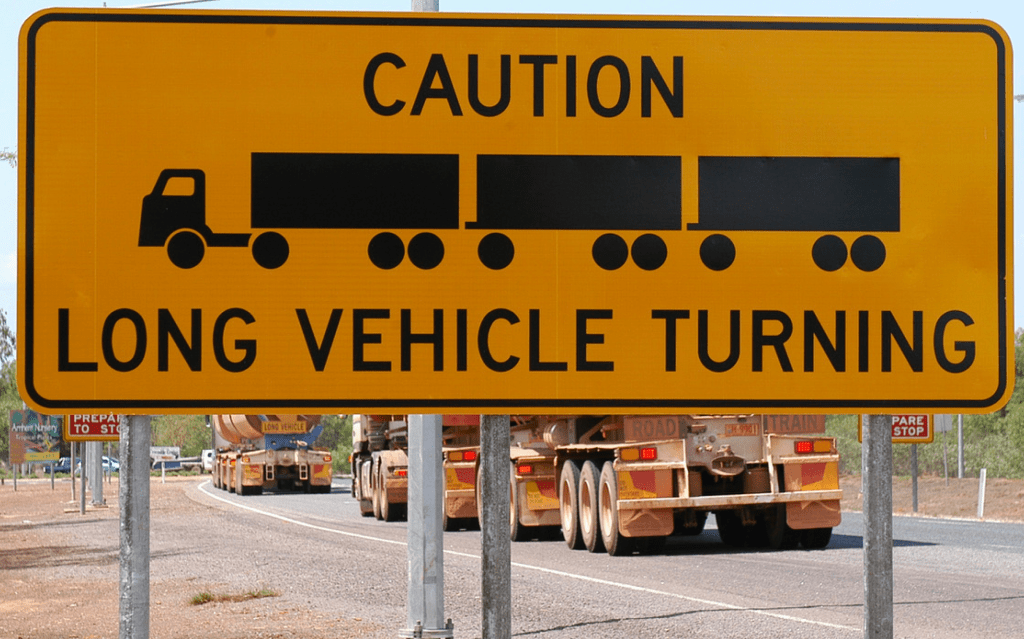 A road train usually consists of three trailers and one tractor – a length of just over 175′ when driven on public roads. They are not always easy to get past and they stir up quite a wind when they pass you. They are also difficult to park and thus truck stops have very large parking and pull-off areas – very large.