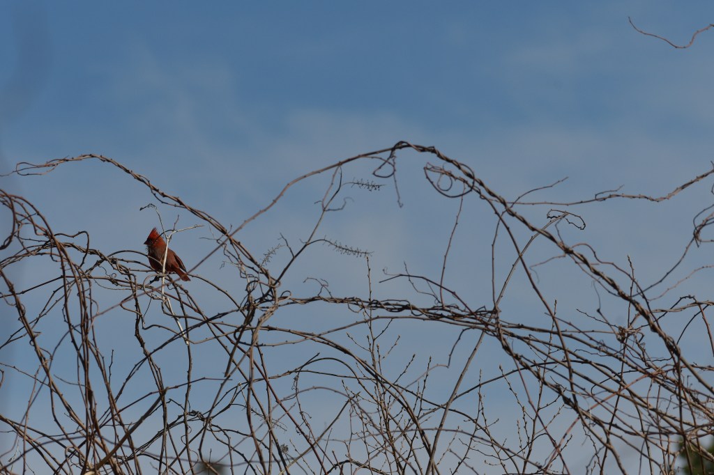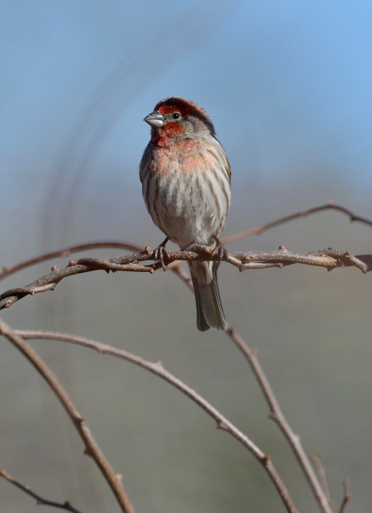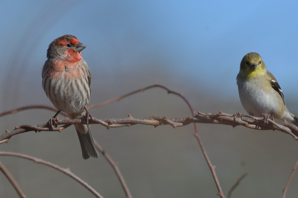 We have American robins (AMRO) all winter here on Cape Cod. They are sometimes seen heading to a roost site in the late afternoon. Our roosts can contain thousands of birds; usually in a red maple swamp. During the day they scatter about looking for old fruit and berries that persist into the winter. This one didn’t pose very well and the picture is pretty average, but it is a reasonable bird to start with.This northern cardinal (NOCA) was cooperative but not close. The males are starting to whistle loudly as the days get longer and warmer. Can nest-building be far away? The cardinals are seed eaters and many can be found at bird feeders where seeds, especially black oilseed sunflower, appear like magic.I was in the car and not able to get where the light and bird combination was best. Hence this very nice eastern bluebird (EABL) is a bit shaded and yet still pretty nice. The males, like this one, are rich in both the reddish color and the blue. Some bluebirds winter here and others migrate – I have no idea what they are thinking.The house finch (HOFI) is a bird that older folks often think is a purple finch (PUFI) – but not so. The house finch wasn’t here when many of us were kids but even then the purple finch wasn’t very common either. Anyway, today we have pretty much only house finches. The males can be quite red and the females and young are rather a dull grayish-brown. Some of you may get purple finches at your feeders as migrants heading north in March and April.This is a house finch male (on the left) sitting with a second cousin – the American goldfinch (AMGO). The AMGO is a bit yellow but has no black on the head; the yellowish eyebrow and the greenish patch below and behind the eye make me think this is a winter-plumaged male; just a bit slow in starting to turn bright yellow.