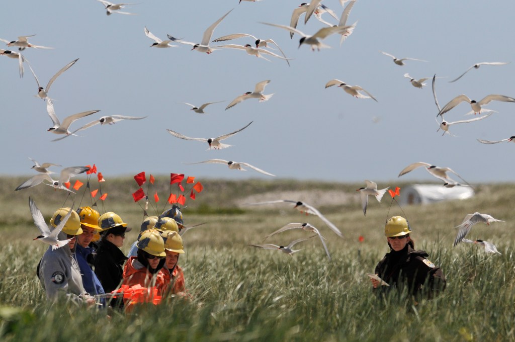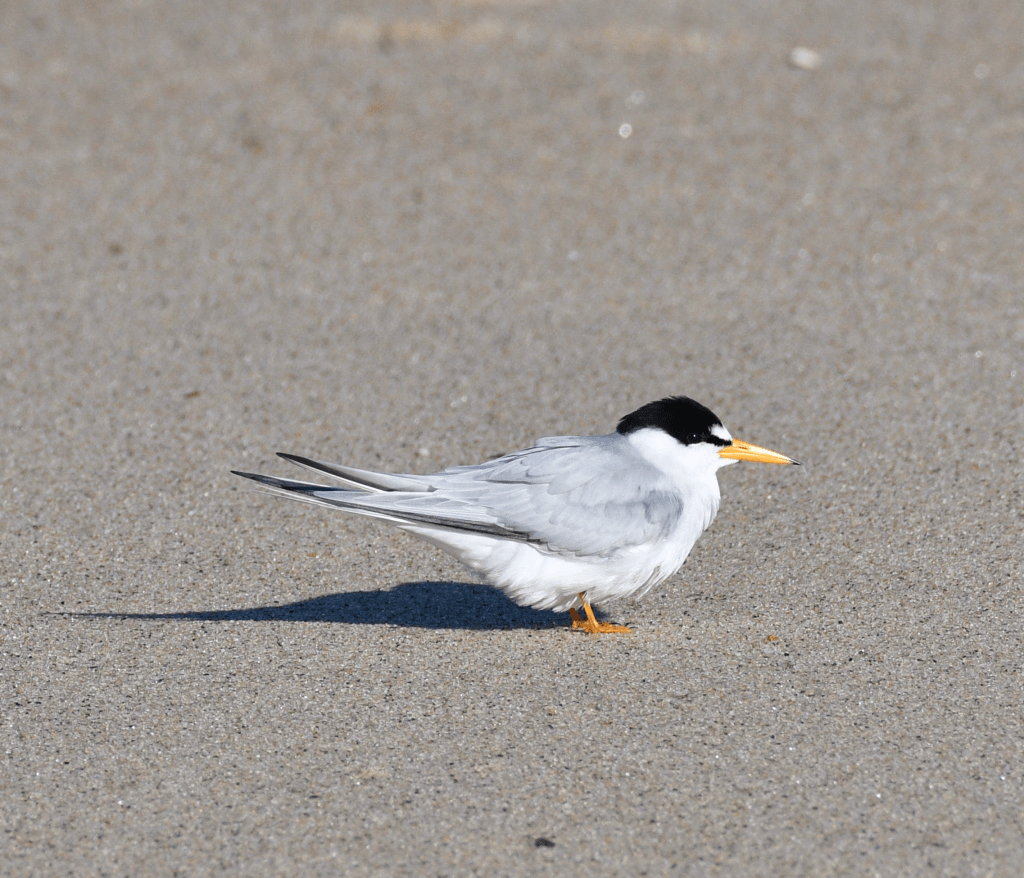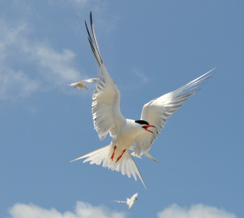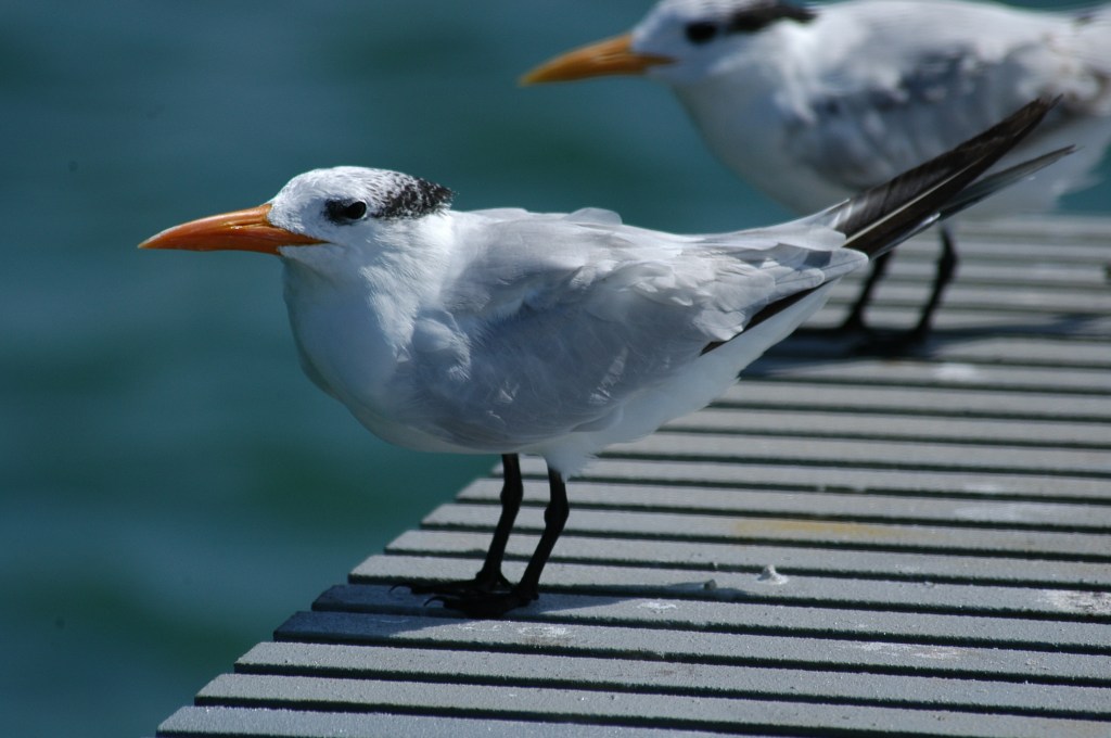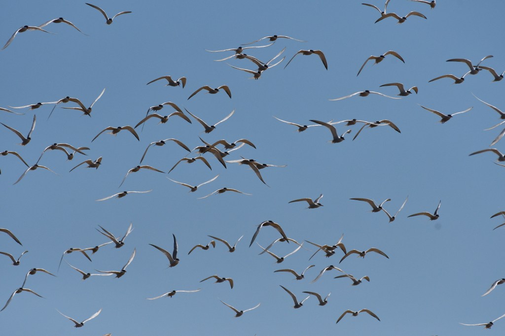 The Black Tern nests in marshes and swamps. It is a light flier and very buoyant as it goes about its work. Even though they nest over fresh water they are regularly seen migrating over salt water, very often well off shore.The Least Tern is about the size of a Northern Cardinal; smaller than an American Robin. In addition to the Atlantic coast population they are found inland along the main rivers of the US and there is a population on the west coast as well. The inland and western populations have been listed as “threatened” and the eastern population as a “species of concern”. This circumstance occurs because they invariably choose beaches where humans recreate. The birds often come out on the short end of the stick when off-road vehicles, beach-goers, and dogs are involved. They are a delicate bird but with a direct and strong flight. The yellow bill with a black tip is diagnostic when seen on a small tern.They have rather long wings for a small bird and are strong fliers. They feed by plunge diving for fish, small fish as you might imagine, in shallow water usually over sand flats.They are quite common throughout New England beaches now as the Park Service, Fish & Wildlife, and many towns and private agencies have protected their nesting sites along with the protection given to the diminutive Piping Plover (PIPL).The most common tern is the Common Tern. Like all the terns this is a migrant with many miles under its feathered belt. The orange bill with a black tip is characteristic and often easy to see. They nest in large colonies and are most successful when nesting on islands where predators are limited. In many colonies Great-horned Owls (GHOW) and Black-crowned Night-Herons (BCNH) are the greatest threat as they can fly in from offshore. When they nest in main land colonies they will abandon if something like a Red Fox begins to take eggs or chicks (or perhaps a weasel or mink or coyote or gray fox or raccoon or skunk, etc…).They are very similar to the Arctic, Roseate, and Forster’s terns in appearance. It seems the gray mantle with light colored wings with darker tips to the flight feathers is a very workable design for doing what terns do. They nest inland as well as coastal. The young leave the shallow scrape of a nest after a couple days but hang around near the nest site for 3-4 weeks. After fledging the young will follow the adults for another 6-8 weeks.The colonial birds will rise up in a “fright flight” at the mere presence of something odd. In some cases it seems that if one bird sees a shadow they all will bolt into the sky. When something, or someone, actually enters the colony they will fly at the intruder, calling loudly, and try to drive it away by constantly bothering it. It is usually a noisy and often smelly trip through a tern colony.The largest colonies are all well managed and protected. The US Fish and Wildlife Service manages the colony nearest to me. They census and monitor the colony throughout the nesting season. As the Roseate Tern is a listed bird there can be some management of predators in order to allow the Roseates the best chance of nesting success.Counting nests and eggs is a tedious job; walking shoulder to shoulder through the colony locating, avoiding, counting, and recording the many thousands of nests.The Roseate Tern is similar to Common and Arctic. It has a longish black bill and flight feathers that are quite pale. It may be hard to perceive from the pictures but it is lighter overall when standing with a bunch of Common Terns. The youngster has a scalloped pattern to the back feathers, a characteristic of the young roseate.The general pattern of “tern-ness” carries over to this larger tern; the Royal Tern. This its mostly a southern coast and Gulf of Mexico resident but we see them every year up in New England. They are generally gray and white like so many other terns. By the way a few of the pure oceanic (pelagic) terns are not gray and white. The two types of noddies, the bridled, and the Sooty terns are strikingly different looking; noddies are brown all over and the bridled and sooties are black and white with lots of black.There are a couple terns that have a distinct winter plumage. They all change “headgear” for the winter but the Forster’s Tern develops a mask and loses the black cap. In breeding plumage it has an orange bill with a black tip and a full black cap. It is a bird that nests on inland wetlands west of the Mississippi River and up into southern Canada. We see it here in the east after breeding. They are one of the few terns that can be found along our coast (usually well south of New England) in the winter.