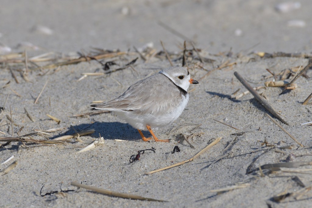 The Piping Plover is a small, short-billed, little plover of the sandy beach; a group often considered by casual observers to be sandpipers. They nest in much of the southern Canadian grain provinces and down through the Dakotas into Nebraska. But we see them here along the northern Atlantic coast as the beach-nesting little gray ghost that can stop off-road traffic in its tracks (often deep sandy tracks which is where the baby plovers like to hang out). The Piping Plover is light gray on the back and most of the head and they blend in easily with the quartz rich sand of our shoreline. Due to its modest numbers to start with and its use of a highly sought after human resource (the beach) they have been negatively impacted by an ever increasing human population and its recreational activities all along these Atlantic coast beaches – and by agriculture in the west.