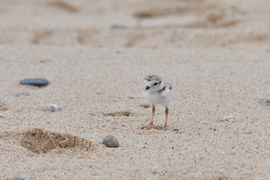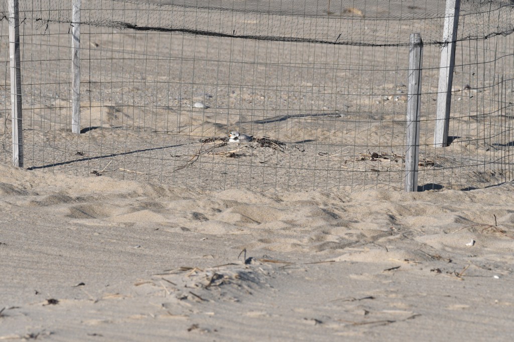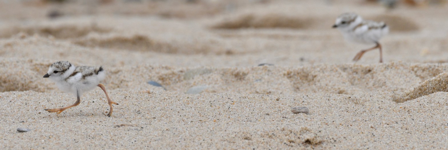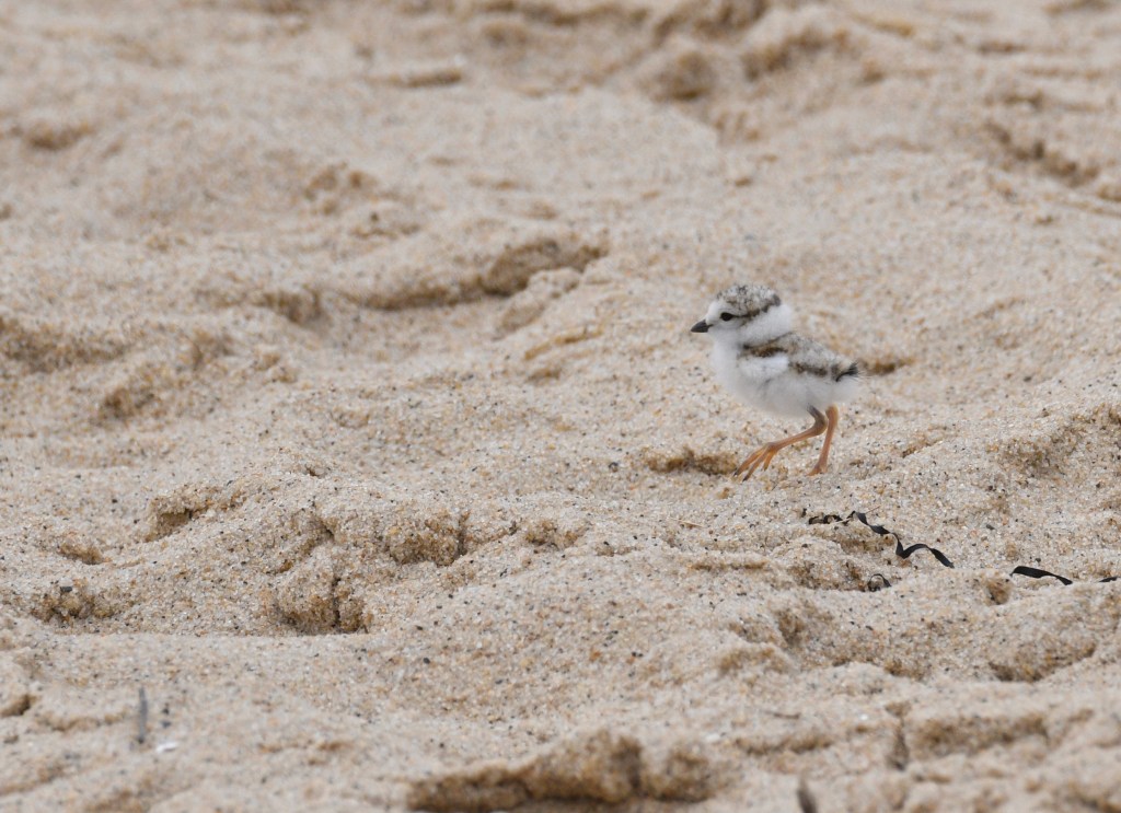 Fitting in – that is how they survive. They are small and fairly quiet. They have to blend in in order to last through the breeding season. They arrive back in the northeast in March and April and nest from May into June. If all goes well the chicks emerge in mid to late June and fly by mid -July. The sexes are similar; both being gray with an orange bill and a neck band. The female of a pair is usually discernible by being a bit less obviously marked around the neck and maybe a bit drabber overall. But sometimes it is a guess as to which its the male or female. From some angles it isn’t easy too tell drabber from non-drabber. The neck band is usually bolder in males and more complete. The pair stays together through the nesting season and both follow the precocious chicks around the beach after they hatch. They will make a flopping and noisy display to lure predators and visitors from the area where the chicks are located. They defend the territory and advise the chicks through chirps and whistles.Because beaches are heavily used by people there is often a good deal of waste food for gulls, foxes, coyotes, and crows to glean. The presence of these scavengers increases the pressure on the Piping Plover. So, the beach managers in New England (management is less attentive on many more southern beaches) will use what we first called an “enclosure” to protect the nest. But as the whole idea is for the plovers to be able to come and go it really doesn’t enclose much of anything. It really is an “exclosure” that repels crows, foxes, skunks, and other beach predators. This gives the birds the advantage of, at a minimum, hatching a full clutch.There are two kinds of bird babies: altricial and precocial. The altricial babies are hatched blind, featherless, and helpless. The familiar yard birds need parental care in the nest for a couple weeks. The precocious youngsters can walk or swim or both right after hatching. The obvious precocious young include ducks, grouse, shorebirds, and others like ostrich and tinamous. The parents may brood them in chilly or rainy weather and oversee the activities that the little ones undertake, but precocious young can feed themselves, and or swim, just after hatching. This little guy may be two days old but is still nothing but a bit of fluff on the beach.At this young age they are feeding themselves. Most plovers eat what they see. They follow motion and chase it down. The youngsters are born with this skill and are on the chase right away. The adults do not show them food nor bring them food. The parental role at this point is to keep predators and trouble away from the hatchlings. The male will assume most of this role after the first four or five days. Like many of the plovers the adults will chirp and walk obviously to attract the attention of a predator (or human pedestrian). If need be they will fake a broken wing and flop along the sand. A fox will be enticed and then disappointed when the “injured” bird flies away.