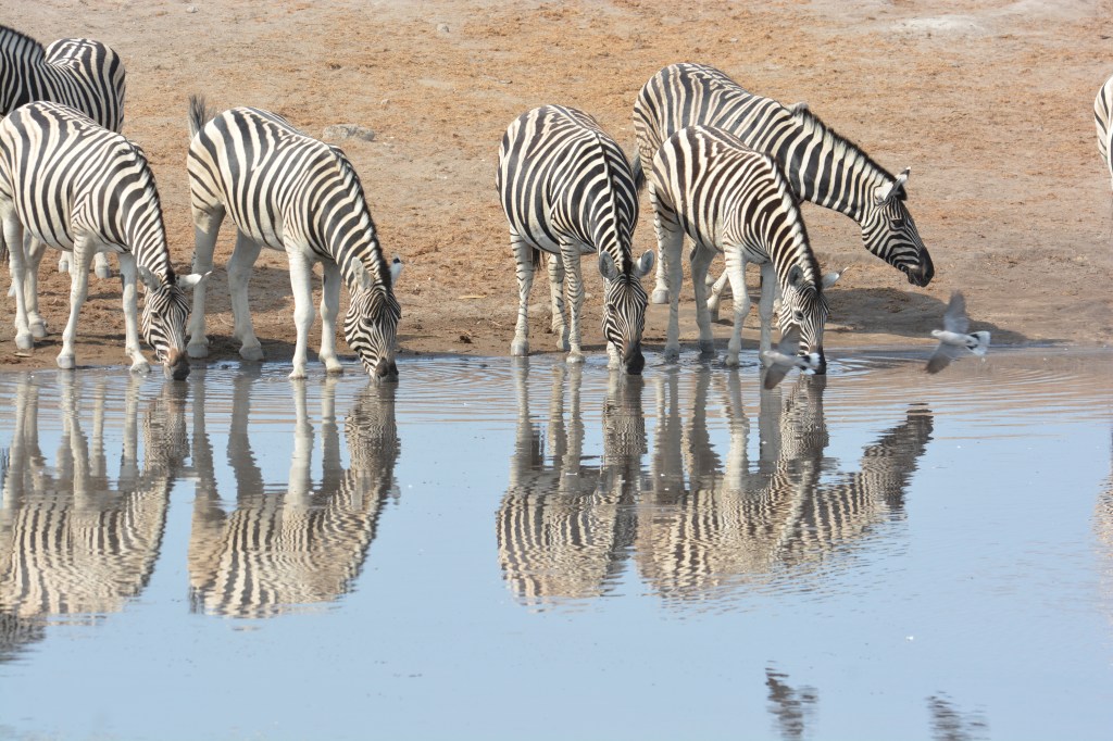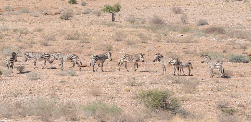 The zebras shown in the first images were all Plains Zebra; or Common Zebra or Burchell’s Zebra. They are rather sharply marked with black and white stripes. As you move south the animals become a bit more hazy with a dusky gray “shadow” stripe often showing in between the black stripes. The zebra above is from South Africa and is rather typical of zebra in the southern part of Africa. Most of the open grassland habitat is found in Kenya and Tanzania where the sharply black and white zebra live and the southern animals have habitat that is a bit more wooded. Perhaps this has something to do with their tendency toward shadow striping.The shadow stripes are more obvious on the rump as you can see in this animal. This habitat is also rather typical of that found in the southern african country’s of South Africa, Botswana, Zambia, Zimbabwe, and parts of Namibia. The dry rugged portion of Namibia has another zebra type called the Mountain ZebraYoungsters are born in December-March in the Serengeti as the herds arrive in the southern part of the migratory route, but in southern Africa there is much less of a migration and youngsters are born throughout the year. The gestation for all zebra is about 380 days or a year and a few weeks. The young will stay with the family unit for about one year and then go off and join a “herd”. As they mature they will form their own family units.They will live to be thirty years or more in the wild. But many don’t.Many of the safari destinations are national parks. Many of the national parks manage water to move wildlife around and to keep naturally wet areas from being over used. A water hole offers photographic opportunities and you can find animals at water holes most any time of day. Grazing animals get moisture from the grasses they eat but almost all large animals will use a water hole at some time each day.This zebra could be from the northern population as it has sharply black and white stripes, but it also has a modest shadow stripe. It is from the northern population. The bird on the zebra’s back is a kind of specialized starling called an oxpecker; a Red-billed Oxpecker in this case. This species, and its Yellow-billed cousin, make a living by cleaning the larger animals of the plains. They will travel in smallish groups, family groups most likely, and stay with the big mammals day after day. They will pick ticks, and lice and flies from the ears and noses of Cape Buffalo, giraffes, zebra, and most antelope and gazelles. They will find ticks and insect larvae in the “legpits” of the big herbivores. They will also peel and eat scabs from the skin of these animals and return the next day to get the newer scab as well. There is a starling called Fischer’s Starling that travels in more starling-like tight flocks that is also a predator of the insects that bother big mammals.This is another older image take north of the equator in Kenya. North of the equator doesn’t seem like much of geographical designation but in east Africas there is quite a real meaning to the phrase. There are Reticulated Giraffe, Gerenuk, and Grevy’s Zebra north of the equator but not south of it. It’s a wonder. Anyway, this old image is of a fine, and finely striped, Grevy’s Zebra. It is a northern animal of east Africa, and one at great risk for reasons I will explain in the future . The legs are well marked and the belly is white. As I said there will be more later of these “north of the equator” animals.Lastly a rather hot and hazy image of the Hartmann’s Zebra, one of the Mountain Zebras. This is a species (most taxonomists think it’s a species) that is found in arid, high rugged locations in South Africa, Angola, and mostly in Namibia. They are in mountains that get moisture from the ocean and thus provide water year round. But it is not water from rainfall for the most part. These animals are more solidly built than the Common Zebra and the three or four very broad and bold rump stripes are a definitive marker. As there are no other zebras in the habitat these animals utilize, identification can be done by geography. If you are in a very remote part of western Namibia or southwestern Angola in hot and arid region with some elevation and you see a zebra – bingo, it’s a Hartmann’s Mountain Zebra. There is still a tiny population of the Cape Mountain Zebra in South Africa, but a very small population and for the most part not really wild.