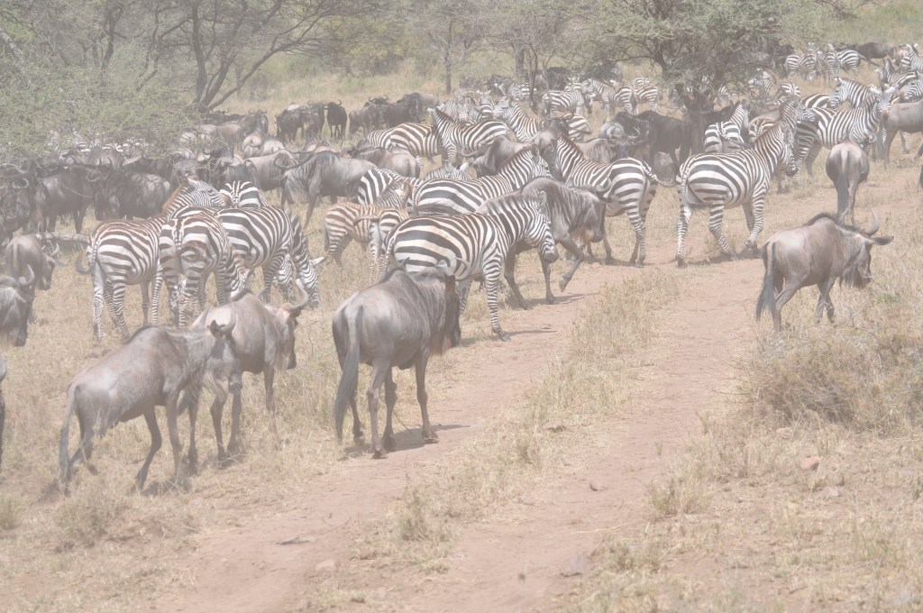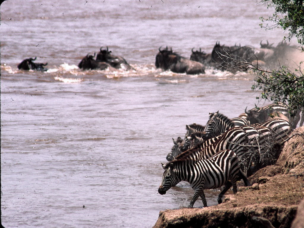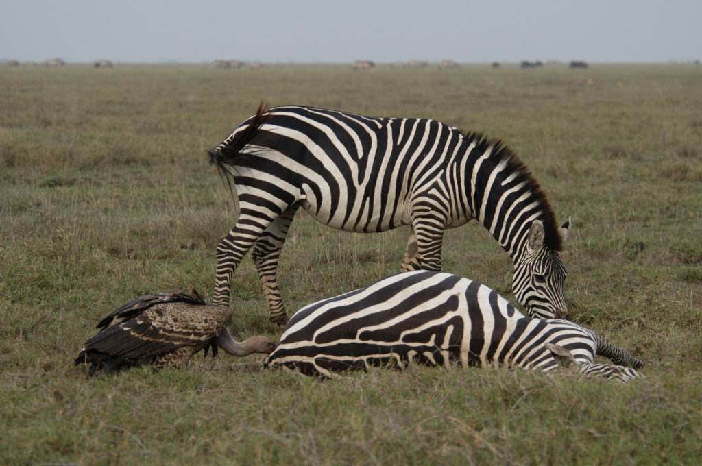 The Migration is a never ending year round event; following the rains and locating green grasses. The wildebeest (White-bearded Gnu), zebra, and many antelope move from the Maasai Mara in Kenya to the east and south over the Ngorongoro Highlands and down into the grasslands of the Serengeti well into Tanzania. Once on the Serengeti they drop their young and rebuild their bodies. They have found the rains and the green vegetation that they need. However the Serengeti grasses wear out and the rains stop and the herds are again forced to move; this time to the west and then north back into Kenya and up into the Mara grasslands. It is here that they can again stop for a few months and eat and mate. But again the rains stop and the need to move arises — this is the annual migration. The renowned anthropologist Mary Leaky always wrote of, and spoke of, the migration in capital letters; it was always The Migration, and she tried throughout her life to get out to the Ngorongoro Crater area each year to be awed and humbled by the moving streams of animals passing southward into the grasslands below.When heading back north into Kenya there are two river crossings. These sites are not on most safari routes and I am afraid that the image above is pretty bad – it was a “film” shot that I have digitized; sorry. But it shows part of the greatest show on earth. The migration is mostly wildebeest and zebra. They are not one huge mass of two or three million animals but more like streams running parallel to each other head down into the sea of grass. Some groups may be only a few dozen and others may be a mile-long train of hundreds. Once they reach the grasslands there can be tens of thousands together, great beasts by the thousands all enjoying the new grasses they traveled so far to intercept.Those river crossings are especially chaotic. Zebra travel as a family, or so the stallion would like to think. There is one stallion, a few females, and the young of that year. The male wants the group to stay together but there are hundreds and hundreds of family groups trying to get up the courage to enter the water. So like a good male he starts yelling – and like kids everywhere – he is often ignored. In a normal day of walking on a trail through the Serengeti the male can keep track of his gang pretty easily. But when they get to the river he loses control. Youngsters start to swim away toward Kenya, he calls them back and they sometimes turn and start swimming back into the hundreds of animals heading toward them. Families of zebra and hundreds of wildebeest are soon mixed up in the blender of the river crossing. Thousands of wildebeest and hundreds of zebra swim with passion and purpose to get to the other side, only vaguely aware that Nile Crocodiles have been waiting months for them to arrive. It is a noisy, dusty madhouse.Once on land and stopped to eat they are immediately sought out by pesky flies. Though is seems that the black and white stripes may have evolved to keep tsetse flies at bay, they often stand as shown above and shake their manes and flash their tails to keep the insects moving. Always good to have a friend. The stripes have been explained many ways; to disrupt predators, to camouflage in the wooded savannah, or to help regulate body temperature but the most convincing research suggests that tsetse flies don’t like to land on a ruptive surface and so they generally keep away from zebras. I have been bitten by many a tsetse fly over the years and I think it only reasonable to evolve stripes to repel them; I would ooze DEET if only I could. The tsetse fly is the carrier of a parasite that can cause East African trypanosomiasis. Most flies do not carry the parasite but the bite is quite a painful nuisance. Tsetse flies are not very common and are rather specific to their chosen habitat. On most safaris the tourists will never see or feel a Tsetse Fly; but it is something to ask about each day as you start off into the bush.The zebra stallion has to stay with his family group. The females can be stolen and the youngsters are, well, they are youngsters. This is a stallion standing over the body of one of his females as they were arriving onto the Serengeti near Naabi Hill and the Ndutu road. She is full with child and simply dropped dead as she was walking along. You never know about these things and conjecture is merely conjecture; perhaps something to do with her pregnancy, perhaps some bad food or water, or a genetic disorder, we don’t know. But the picture tells a tale. The male stayed for maybe five minutes but had to leave her and gather the others together. The rest of his family was moving along with the migratory wave and he would lose all and everything if he waited to long. He checked her and nuzzled a bit. He looked toward his receding family. He scattered the arriving vultures once or twice and then turned and followed the remaining mares and young into the grasslands. By the way, a White-backed Vulture, like this one, cannot open up a newly deceased zebra. The carrion-eating birds will eat the soft parts (eyes, tongue, lips, anus) and wait for hyenas, lions, or the passage of time to open the body.