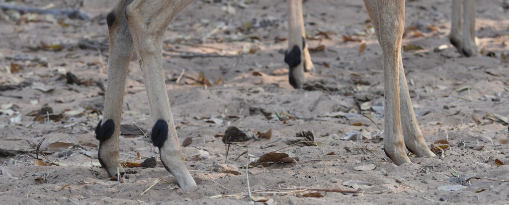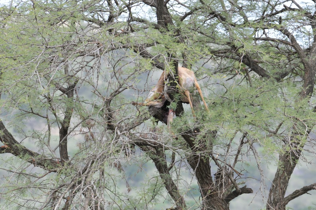 Males will test each other and measure themselves within the bachelor herd. The winner, the strongest usually, will move out from the boys club and try to create and hold a group of females on a territory during the breeding season. Mating, herding, chasing other males (from the females and the territory) and all the related stresses will wear the males down and they are often usurped by a stronger fresher male. The defeated male will return to the bachelor herd and regain strength and (perhaps) try his luck again later in the season.Young males will begin to sort themselves out long before they are sexually mature. Notice here the two-toned brown body with a mostly white belly. There are two black rump stripes with a third one on the tail. Males will leave their mothers and join bachelor herds at about 8 months of age. Female Impala do not carry horns. The horns are mostly hollow and are not shed annually like the deer family (White-tailed Deer, Moose, Elk, Reindeer/Caribou). This is probably a good time to mention that deer and antelope are not too closely related. The deer are Cervidae (47 species) and the antelope are Bovidae (135 species of cattle goats and antelope). And further along the taxonomic line it should be noted that Impala have no close relatives within the Bovid/Ungulate/Ruminant group. They are rather unique; following their own evolutionary line. The group that they are in also has the similar Hirola, as well as the much less similar Topi, Bontebok, Kongoni (Hartebeest), and Wildebeest, a rather unlikely assortment of animals.The female impala are sleek and rather elegant looking. They are always in some sort of group. When startled the group will bolt and animals will leap and bound in long mammalian flights as they escape from the danger. They can leap 10 feet (3m) in height and 30+ feet (10m) in length with ease. It is quite a scene when a group of thirty of forty or more animals depart in a hurry, scattering in all directions; like mammalian fireworks. The youngsters often chase and leap for exercise, practice, and seemingly, the fun of it.Female Impala will bear their first young when they are about a year and a half old. One or two young is normal. The young can be left out for a few days but are soon brought into the group where they form creches with other youngsters. They nurse from their mothers but generally hang with the other kids. Males won’t breed until they are at least four years old and can hold a group of females and a bit of territory. Impala carry scent glands in black tufts of hair on the rear legs. Males will also exude scent from glands on the forehead to mark territory and announce their presence. The chemistry is just now being unraveled and the real intent of the glands is not yet nailed down. It is surmised that the scent glands inform other group members as to where the animal is located; but how transmission occurs is not well understood. It was thought that the scent was a “follow-me” scent but that requires immediate dispersal in all directions. It may be more likely that the scent is a steady-state odor that informs regarding health and reproductive status (an olfactory Face-Book page). These scent-emitting black leg tufts are found only on Impala and not on any other antelope or gazelle. Many other species have scent-emitting glands but not on the lower part of the rear legs.Impala will drink daily if they can. They will also forgo drinking when new grasses or other foods provide enough moisture. You might notice that the second animal in from the left is a bit bigger and has horns just visible under the female on the very left that second-in Impala is a male.One of the dangers in being a common herbivore is that you taste good and are available. Predators will eat herbivores throughout the year. Lions often need larger prey than Impala but a smallish group of lions will take iImpala on occasion. Leopards find Impala just right and often seek them out. Hyenas and Wild Dogs will hunt Impala and Cheetah will take youngsters and occasionally full grown animals as well. The Impala in the tree (above) is a cached leopard kill.