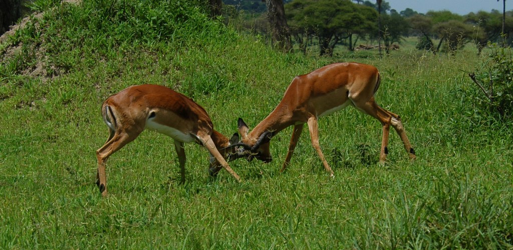 Impala are largely browsers taking pods, buds, fresh twigs, and new foliage from grassy woodlands (mostly during the drier seasons) but will graze heavily on fresh grasses during the wet season. They are often seen in rather large groups with 30 to 120 females in a rather stable group and males in bachelor herds for the most part. Males will compete for dominance and then try to hold a group of 5-20 females on a territory for breeding. The male-male competition continues throughout the breeding season. The dominant males do get to breed the most, but they also forgo feeding to shepherd females and chase intruding males. Few males have the stamina to hold both females and territory throughout the breeding season.