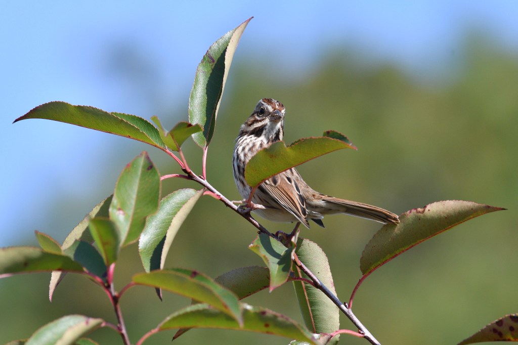 The bird in the lead image (up above) is a sparrow – perhaps you guessed that. It is a tightly marked Lincoln’s Sparrow with it head tucked into a hydro-seeded patch of earth. It is noticeably different from the Song Sparrow shown in an image below. Lincoln’s Sparrows nest in the Boreal Forest of Canada but in clearings with leafy patches in the forest usually adjacent to bogs or ponds. Learning and appreciating the dull and inconspicuous birds is both challenging and tedious – but worth it in so many areas. A comparison of Lincoln’s and Song Sparrow might be done with a fabric reference; the Song has a burlap sort of weave and the Lincoln’s is more like a tightly woven bed sheet sort of fabric.