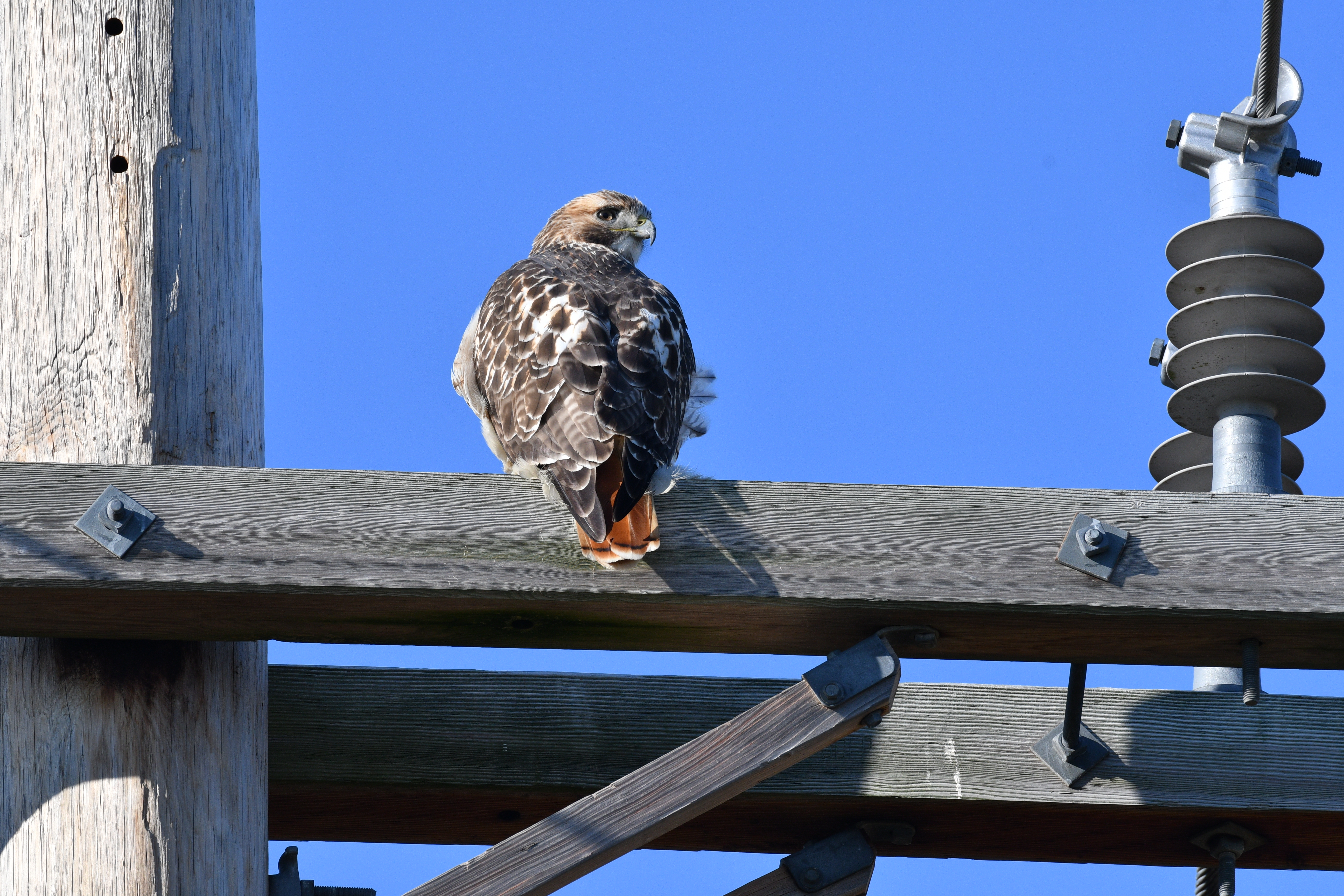 This site is quite well known for its birds of prey. Over the years the rough grasses produced a small mammal called a Meadow Vole by the thousands and they fed an array of hawks, harriers, and falcons. Now that the rough grasses have been plowed under on about 20% of the sanctuary things might change a bit but the birds of prey are still a feature. While we were there we saw four different Red-tailed Hawks (RTHA). This Red-tail was rather blasé as he sat on a cross bar and watched us walk past.The adult birds develop the red tail and it is an obvious characteristic. It takes about three years for the tail to change from a striped brown pattern to a nearly totally red pattern. Both of the birds shown are adults with red tails.In addition to the Red-tails we had two Peregrine Falcons (PEFA) zipping around the fields. They were intent on catching one of the shore birds that were on the fields and this one eventually caught a Dunlin and ate it on top of one of the poles. Most of our locally nesting Peregrines do not really migrate. They may move a couple hundred miles in total but not really changing habitat and behavior. Thus when we see what appears to be a migrant falcon it is likely a bird from Canada or Greenland as these populations migrate long distances, leap-frogging over our more sedentary birds.The sanctuary has always been too heavily vegetated for ground-feeding shorebirds to linger. But with this years plowing and planting it is attractive to many migrant shorebirds. This image shows a Black-bellied Plover (BBPL) (four actually) and a few Dunlin (DUNL) using the exposed ground to locate edible creatures. They are most likely eating beetles and caterpillars. Black-bellies are often found in and on grasslands but Dunlin, though widespread, are not as common.As Dunlin may be a bit of a new name for some of you, here is a closer picture of one. This is from a nearby beach where they examine the wrack line and sandy edges. It is a medium sized bird with a decurved bill. As I mentioned, they are not uncommon and here in Massachusetts will often stay in large flocks right on into and through our winter. Hardy little guys for sure.This was the rarity that drew birders. It is a godwit; the Hudsonian Godwit (HUGO). Most of the Hudsonian Godwits migrate through central USA and they are seen in small numbers along the Massachusetts coast if you can get to the remote areas they frequent. . Hudsonian Godwits belong to a group (Godwits) that are remarkable for their long distance, non-stop migrations. The eastern population of this species, the Hudsonian, usually flies from the Canadian Maritimes out over the Atlantic, and likely for 5,000 miles non-stop, well into South America. There are other godwits that undertake similar flight; such as the Bar-tailed Godwit which flies from Alaska or Kamchatka to New Zealand and Australia in 8-11-day non-stop flights. The Hudsonian Godwit has not been found staging in South America prior to its northward migration and many of the Canadian nesting sites are still unknown. Many members of this species migrate through a very narrow track in the central part of the USA’s mid-west but as you can tell there is a lot left to learn about this species.